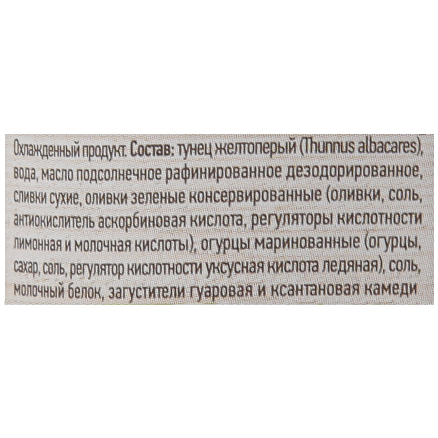 Тунец, сливки и вкусовой ингредиент специи, оливки, огурцы маринованные