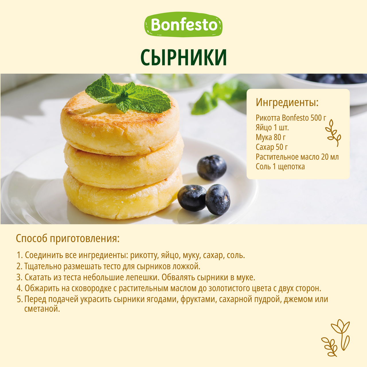 Сыр Рикотта мягкий Bonfesto 40%, 250г - разновидность сывороточных сыров с удивительно свежим и нежным вкусом. Её готовят из сыворотки, остающейся после приготовления моцареллы, с добавлением молока. Этот продукт используют в приготовлении десертов, основных блюд и различных салатов.