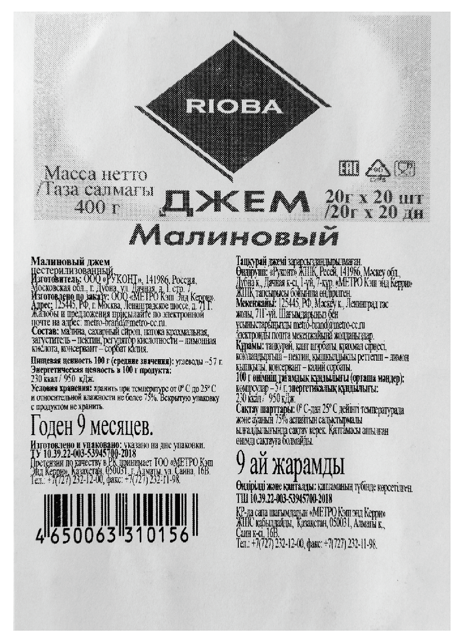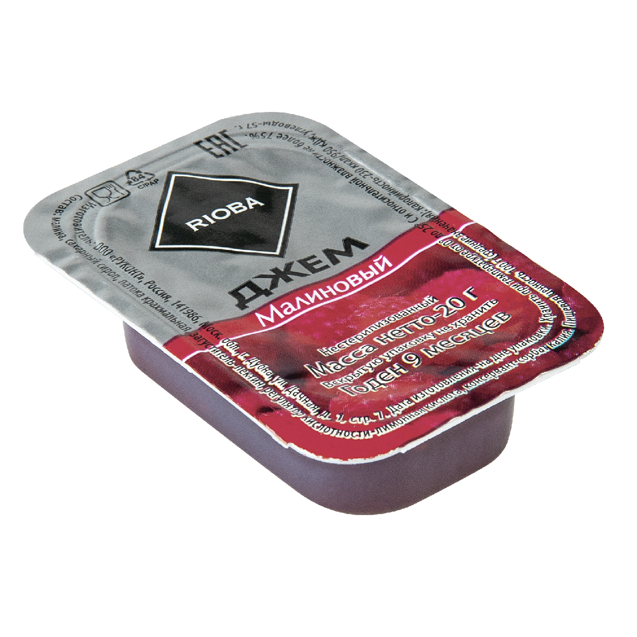 Rioba Джем порционный Малина 20 шт., 20 г – нежный, ароматный продукт, изготовленный из спелой, полезной и вкусной ягоды. Обладает густой, тягучей консистенцией, относительно однородной, с включениями мелких косточек ягоды. Готовится в соответствии со старинными рецептами с применением современных технологий, позволяющими сохранить всю пользу ягоды. Прекрасно сочетается с разными продуктами, используется для приготовления кремов, десертов, начинки для выпечки, коктейлей, морсов, компотов, киселей. Может применяться в качестве сладкой добавки к бутерброду с маслом, сырникам, кашам, блинам или оладьям.