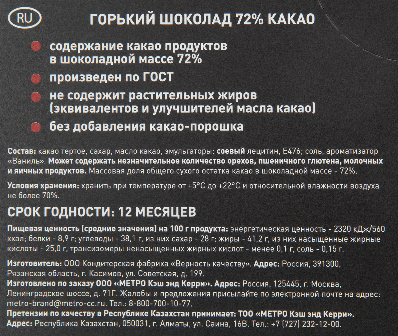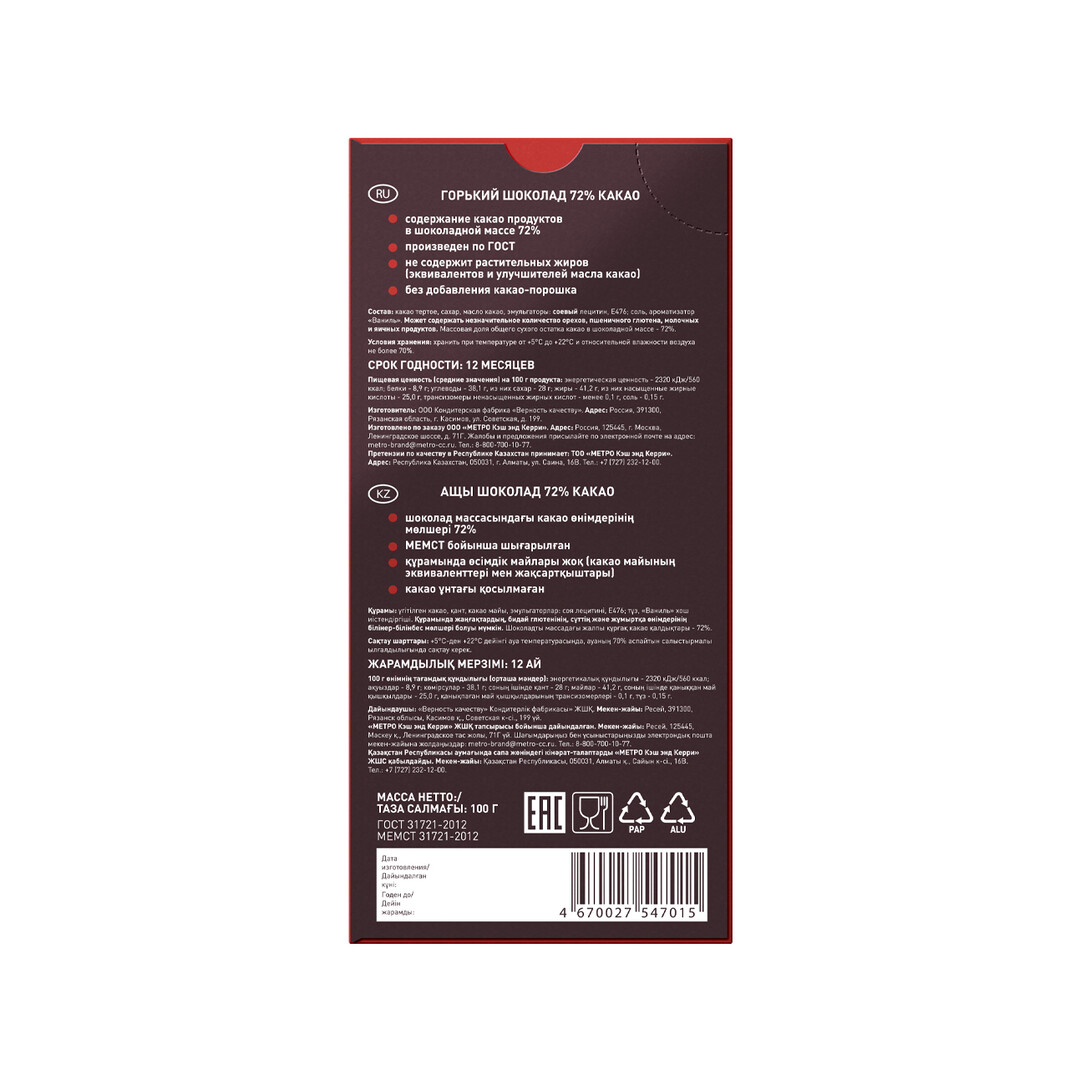 Rioba Шоколад горький 72% какао, 100г — это не только вкусный, но и полезный десерт, который идеально сочетается с чашкой какао или натурального кофе. Горький шоколад содержит натуральные антиоксиданты, а в технологическом процессе производства шоколада не используются красители, консерванты и вредные вкусовые добавки. Достаточно 7-12 г горького шоколада Rioba для обеспечения минимальной суточной потребности человека в антиоксидантах. Продукт предупреждает и замедляет физиологические процессы старения клеток головного мозга благодаря высокому содержанию флавоноидов, отвечающих за активность ферментов, ускоряющих реакции, умственную деятельность. Горький шоколад положительно влияет на работу сердечно-сосудистой системы, снижает уровень холестерина в крови. Продукт создан по собственной уникальной рецептуре и производится только из натуральных ингредиентов. Удобный порционный формат позволяет брать с собой шоколад в институт, в офис и школу.
