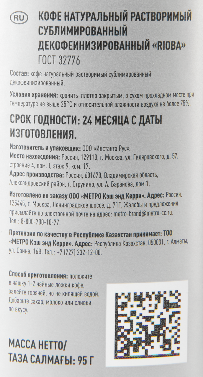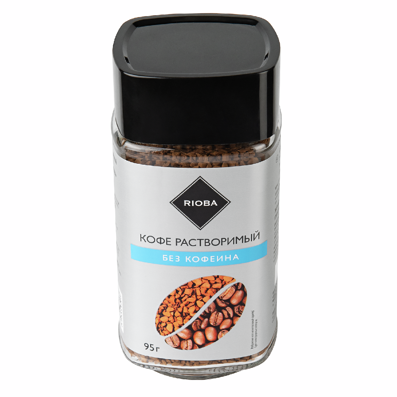 Растворимый кофе RIOBA, 95г, без кофеина. Изготовлен из обжаренных зёрен кофе с полным удалением кофеина методом водного экстракта. Имеет мягкий, сбалансированный вкус без горечи. Подходит для ежедневного употребления, в том числе в вечернее время или при чувствительности к кофеину. Растворяется в горячей или холодной воде.