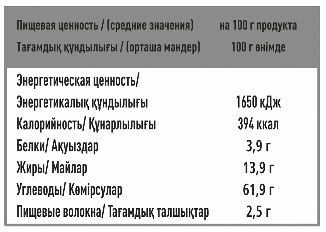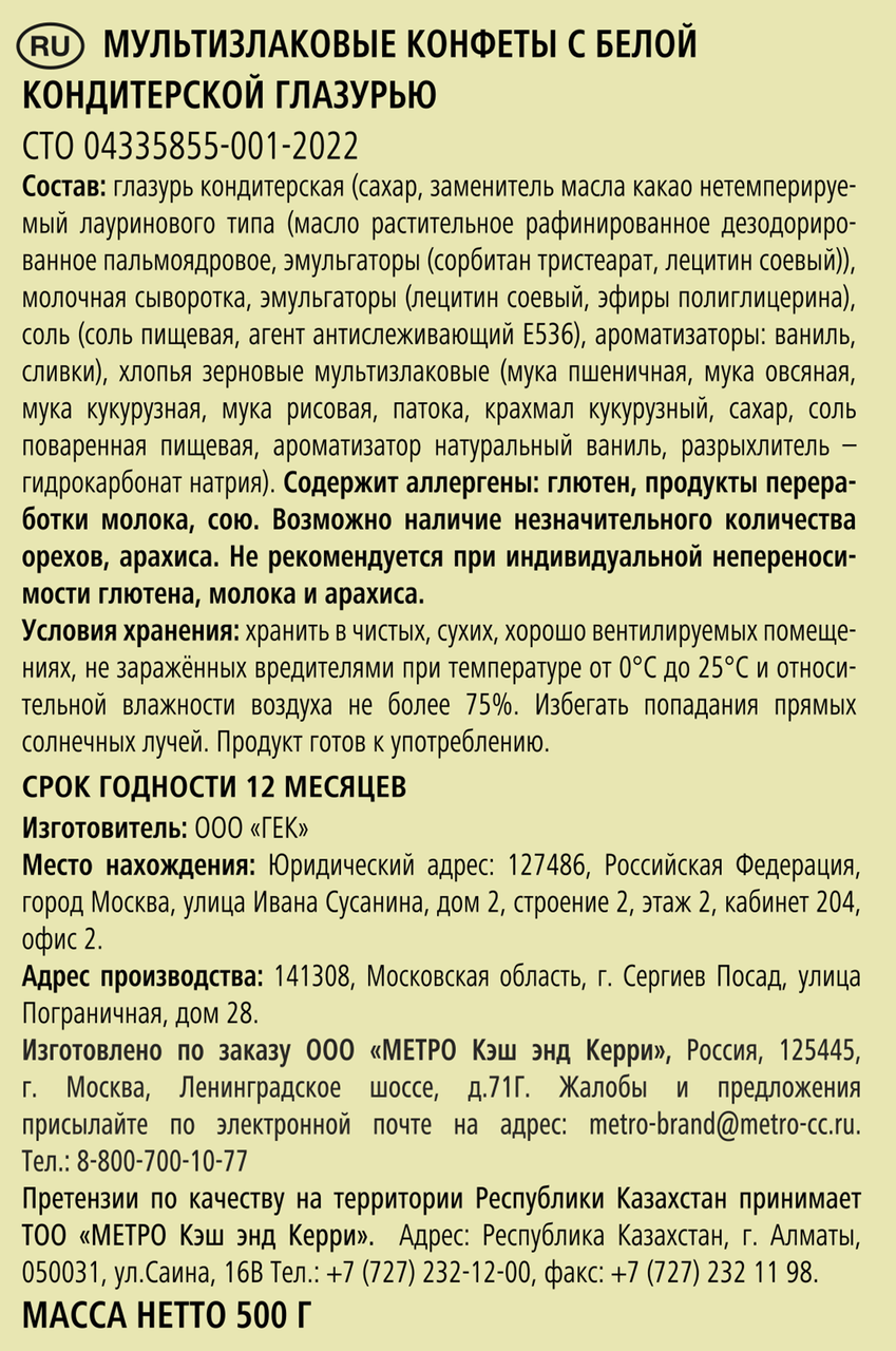 Глазурь кондитерская сахар, заменитель масла какао нетемперируемый лауринового типа масло растительное рафинированное дезодорированное пальмоядровое, эмульгаторы полиоксиэтилен сорбитан тристеарат, лецитин соевый, молочная сыворотка, эмульгаторы лецитин соевый, эфиры полиглицерина и взаимоэтерифицированных рициноловых кислот, соль, ароматизаторы: ваниль, сливки, хлопья зерновые мультизлаковые мука пшеничная, мука овсяная, мука кукурузная, мука рисовая, патока, крахмал кукурузный, сахар, соль поваренная пищевая, ароматизатор натуральный ваниль, разрыхлитель – гидрокарбонат натрия.