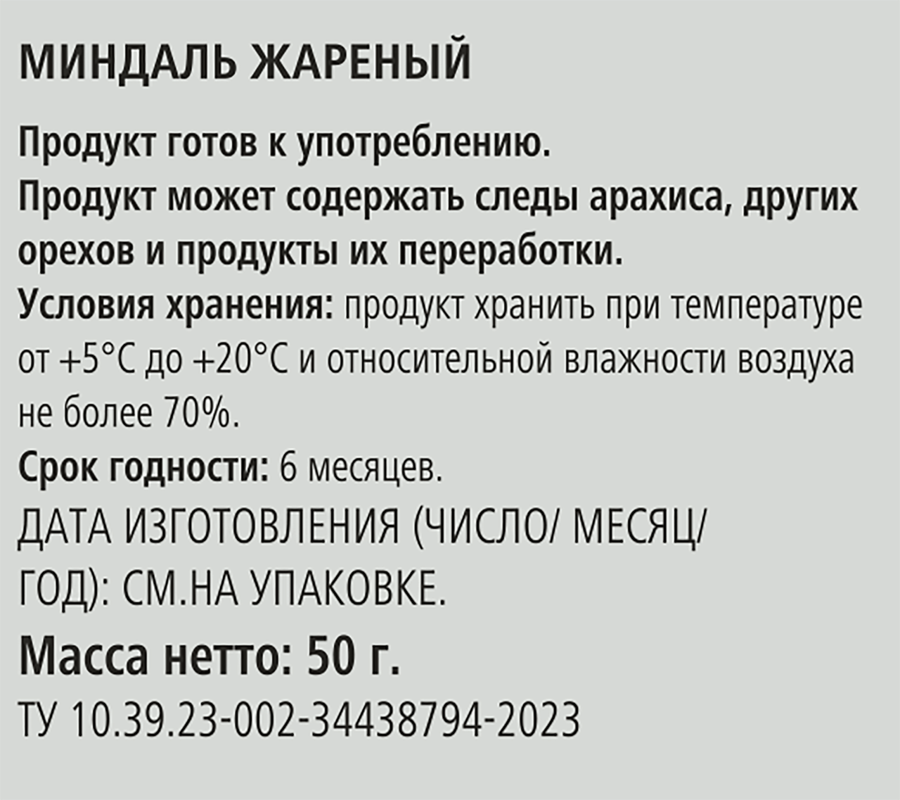 Ядра орехов миндаля обжаренные. Продукт может содержать следы арахиса, кунжута, различных видов орехов, продуктов, содержащих сою, глютен, продукты переработки молока (в том числе лактозу).