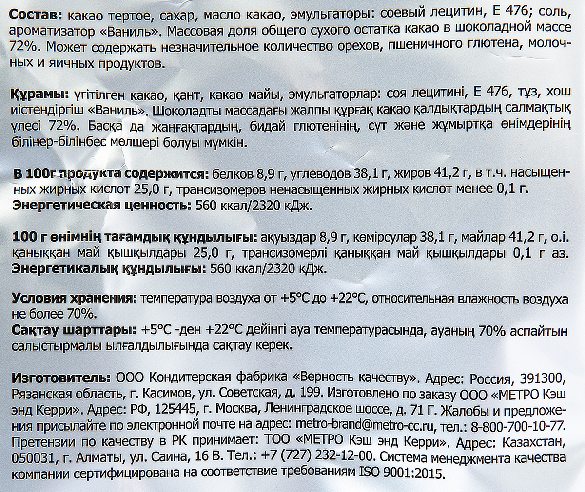 Какао тертое, сахар, масло какао, эмульгаторы: соевый лецитин, Е476, соль, ароматизатор Ваниль.