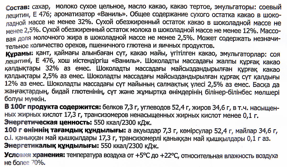 Сахар, молоко сухое цельное, масло какао, какао тертое, эмульгаторы: соевый лецитин, E476, ароматизатор Ваниль.