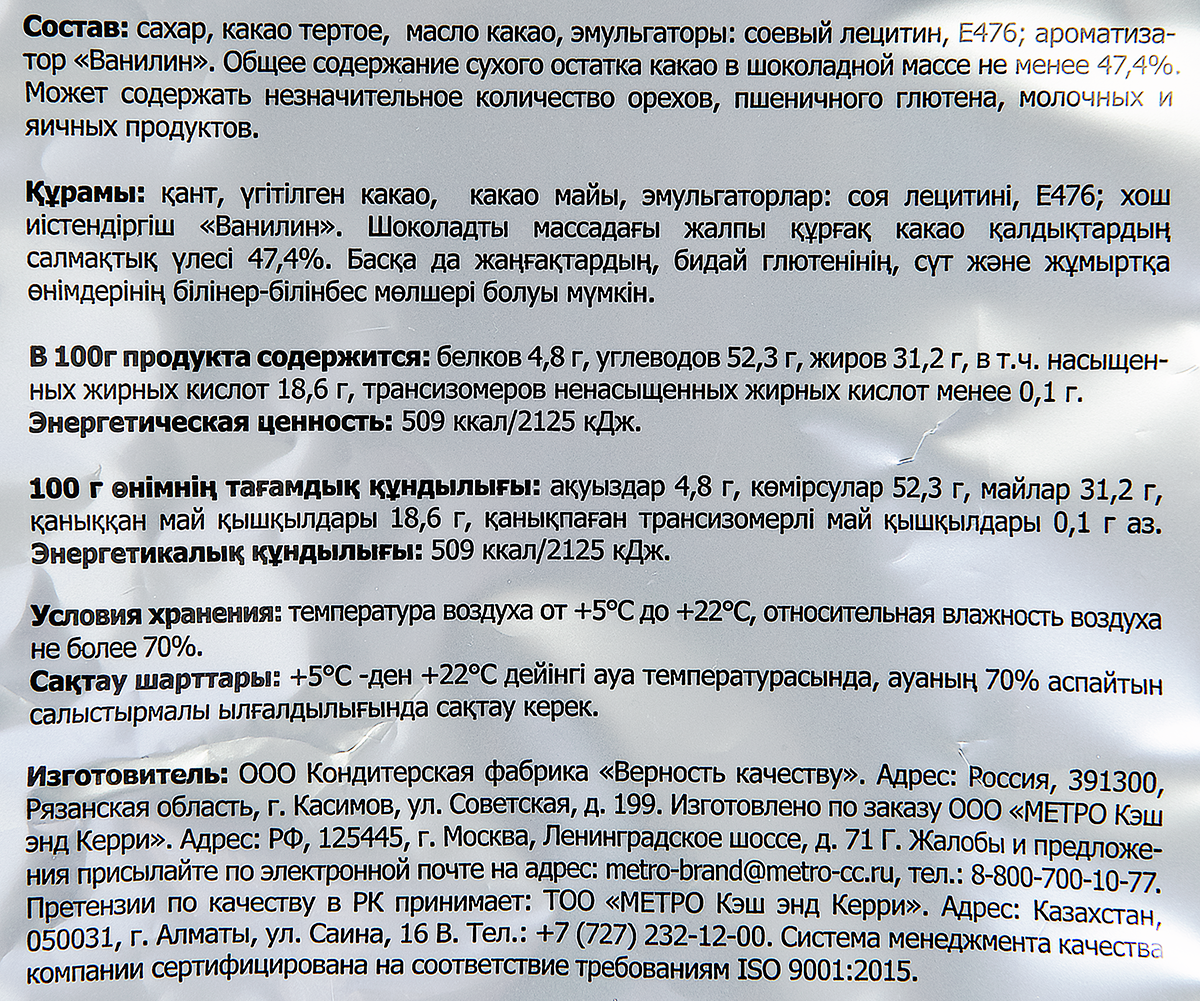Сахар, масло какао, какао тертое, эмульгатор лецитин соевый, Е476, ароматизатор Ванилин.