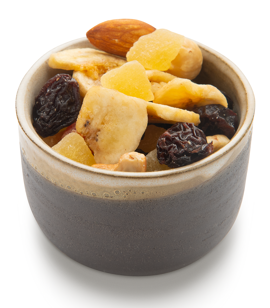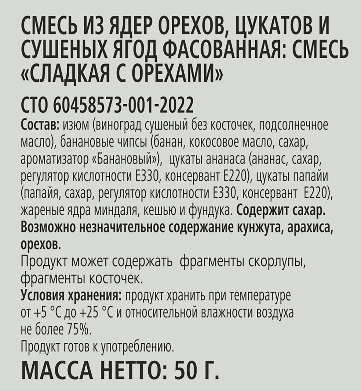 Изюм (виноград сушеный без косточек, подсолнечное масло), банановые чипсы (банан, кокосовое масло, сахар, ароматизатор Банановый), цукаты ананаса (ананас, сахар, регулятор кислотности Е330, консервант Е220), цукаты папайи (папайя, сахар, регулятор кислотности Е330, консервант Е220), жареные ядра миндаля, кешью и фундука.