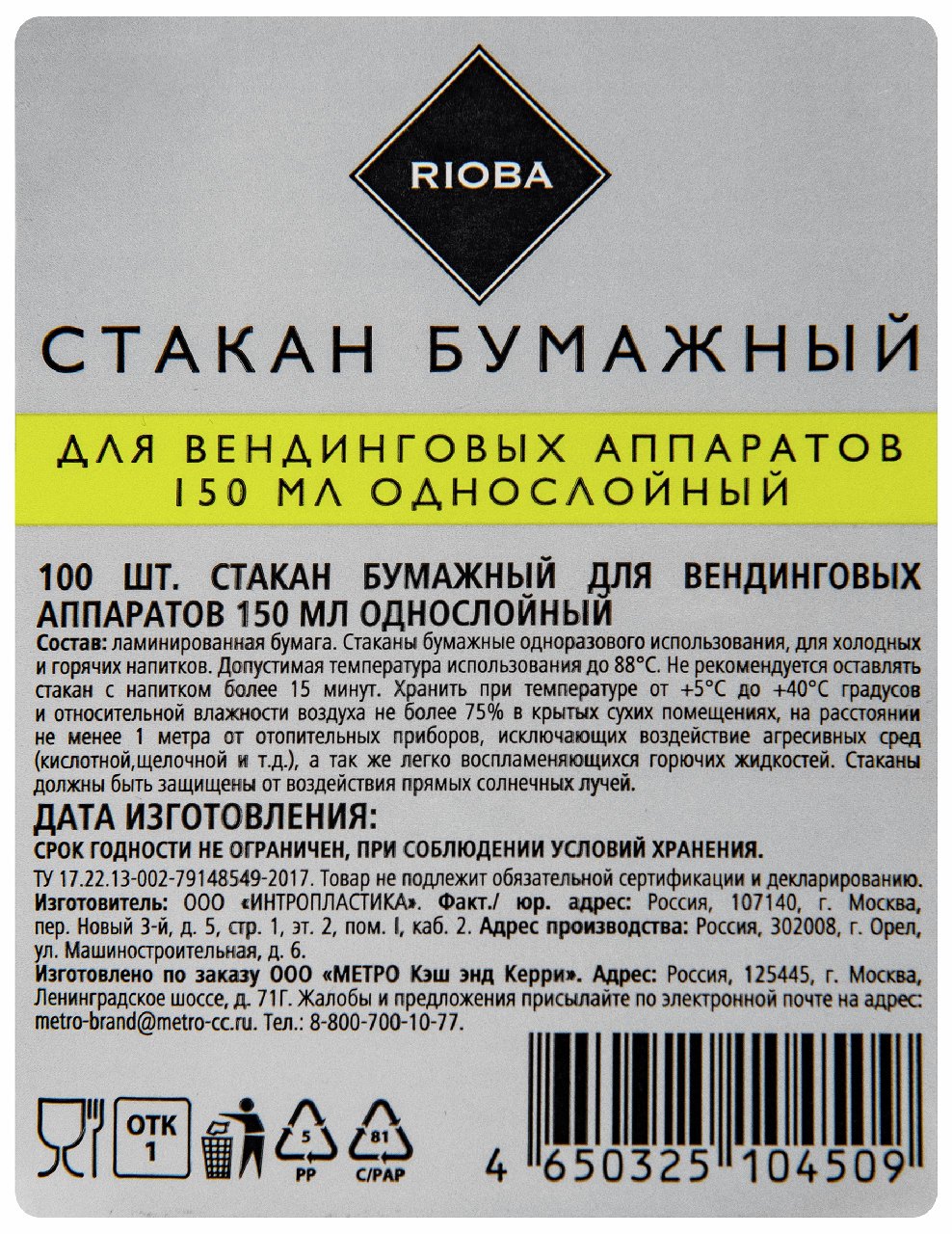 RIOBA Стакан бумажный одноразовый для вендинговых аппаратов, 150 мл, 101 шт. — это абсолютно экологически чистая одноразовая посуда, предназначенная специально для вендинга. Изделия не выделяют токсинов при наливании в них горячей жидкости, плохо гнутся, что позволяет легко вынимать их из автомата, не опасаясь пролить содержимое. Стенки стаканов обладают малой теплопроводностью, поэтому отлично сохраняют температуру жидкости и не обжигают пальцы.