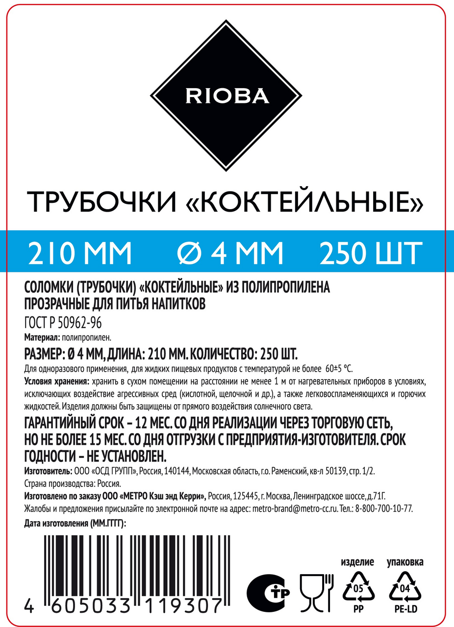 RIOBA Трубочки для коктейля прозрачные 210 мм d4 мм, 250шт изготовлены из высококачественного полипропилена, абсолютно безопасного при контакте с пищевыми продуктами. Подходят для молока, сока, морса, газированных напитков, лимонада, воды, холодного чая и других прохладительных напитков. Это аксессуар для всех типов напитков как для холодных напитков так и для горячих. Легкие и прочные, не требуют мытья после использования и легко утилизируется. Подойдут к любому мероприятию, день рождение, новый год, свадьба, вечеринка, фуршет, банкеты, праздники, застолье, также незаменимы в барах, ресторанах, кафе.
