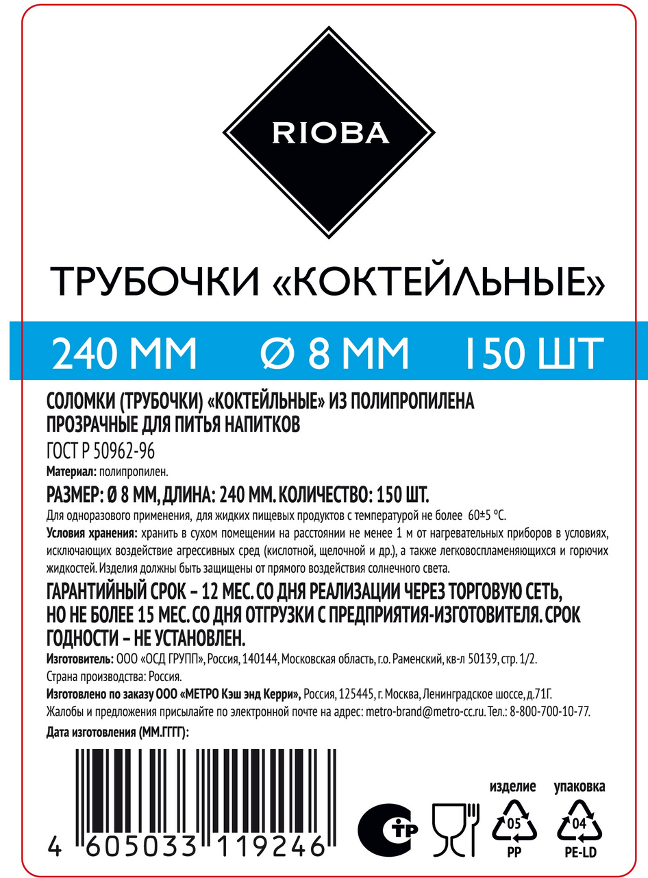 RIOBA Трубочки для коктейля прозрачные 240 мм d8 мм, 150шт изготовлены из высококачественного полипропилена, абсолютно безопасного при контакте с пищевыми продуктами. Подходят для молока, сока, морса, газированных напитков, лимонада, воды, холодного чая и других прохладительных напитков. Это аксессуар для всех типов напитков как для холодных напитков так и для горячих. Легкие и прочные, не требуют мытья после использования и легко утилизируется. Подойдут к любому мероприятию, день рождение, новый год, свадьба, вечеринка, фуршет, банкеты, праздники, застолье, также незаменимы в барах, ресторанах, кафе.