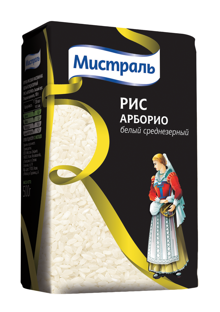 Рис Мистраль Арборио белый среднезерный 500г.Крупа рисовая фасованная. Высший сорт.Арборио является одним из лучших сортов итальянского среднезерного риса и имеет крупные полупрозрачные зерна с характерной белой сердцевиной.Очень мягкий рис Арборио при варке приобретает кремообразную консистенцию и легко разваривается. Поэтому специалисты рекомендуют снимать блюдо с огня до полной готовности риса - тогда через несколько минут рис доварится сам, однако зерна сохранят свою форму.Прекрасно подходит для приготовления классического итальянского ризотто, плова, паэльи и супов.Варить 20 минут.Пищевая ценность в 100г продукта: белки 6,8г, жиры 1,6г, углеводы 78,8г, из них клетчатка 4,2г.Энергетическая ценность: 338 ккал.Хранить в сухом месте.Срок годности 12 месяцев.