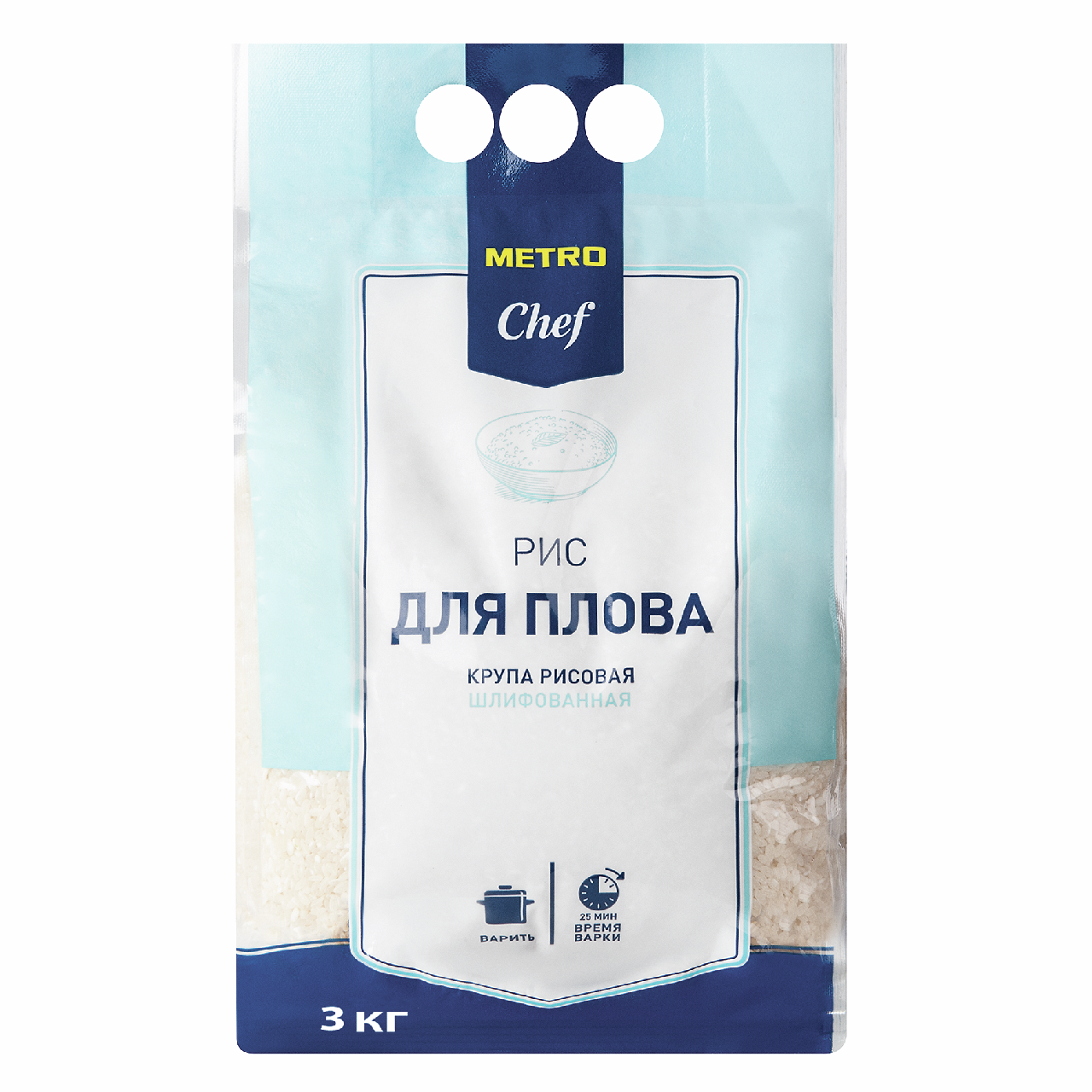 Рис METRO CHEF, 3 кг — полезная и питательная крупа для приготовления рассыпчатого плова. В состав риса входят полезные вещества, витамины и минералы, способствующие улучшению обмена веществ, восстановлению водно-солевого баланса. Рис нормализует систему пищеварения и хорошо выводит токсины и шлаки из организма. Благодаря отсутствию в составе глютена продукт не вызывает аллергические реакции, хорошо усваивается и не утяжеляет желудок. Он также благоприятно влияет на работу сердца, состояние сосудов. При отваривании риса уменьшается его калорийность, поэтому с его помощью готовят различные диетические блюда. Продукт характеризуется желтоватым оттенком, высокой плотностью и сохранением формы зерен при термообработке. Он становится главным компонентом для рассыпчатых каш, запеканок, сырных палочек, плова и некоторых салатов. Приобрести рис METRO CHEF для плова, 3 кг можно в торговом центре METRO.Бренд: Metro Chef.Производитель: Metro C&C.Страна: Россия.Вид продукта: крупа.Тип крупы: рис.Тип риса: цельнозерновой рис.Состав: крупа рисовая шлифованная.Назначение: для гарнира, для плова.Пищевая ценность (на 100 г продукта): белки — 6,5 г, жиры — 1,0 г, углеводы — 79 г.Энергетическая ценность: 350 ккал.Способ приготовления: перед использованием крупу необходимо промыть водой. Для приготовления гарнира используйте 1 часть риса и 2 части воды. После закипания варите на слабом огне под крышкой 20-25 минут. Добавьте соль и масло по вкусу.Условия хранения: хранить в сухом прохладном месте при температуре от 0 до 25С.Срок хранения: 12 месяцев.Упаковка: целлофановая пачка.Вес: 3 кг.