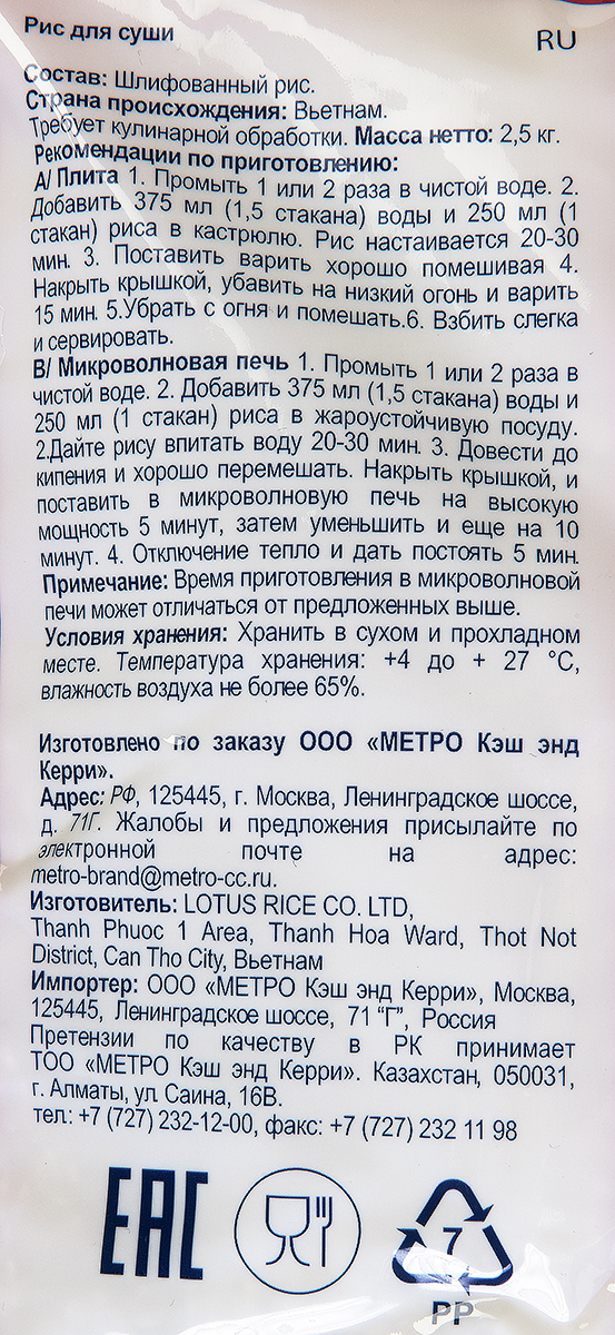 Рис бренда Metro Chef (2.5 кг) имеет мягкий и одновременно выразительный вкус, а также плотную структуру, позволяющую без труда готовить традиционные блюда. Зерно обладает правильной формой, гладкой поверхностью и белоснежным цветом. Рис может выступать в качестве самостоятельного блюда в сочетании с классическими соусами и топингами, использоваться для загущения супов или подаваться с добавками, чаще всего приготовленными из морепродуктов и водорослей. Злак не содержит глютен и обладает сбалансированным составом питательных веществ. Минералы, микро- и макроэлементы, а также витамины, присутствующие в крупе, ежедневно необходимы человеческому организму.