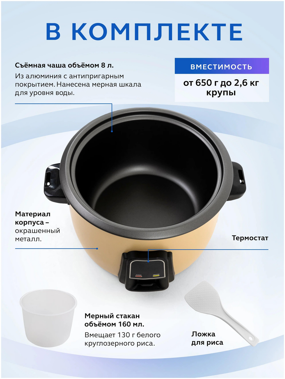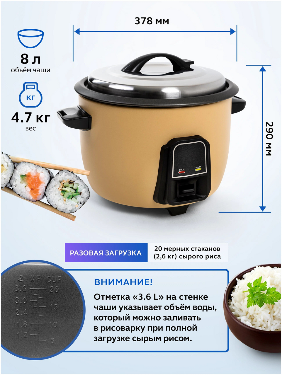 Рисоварка Gastrorag DKR-8L используется для варки и подогрева риса на предприятиях общественного питания и торговли. Оснащена внутренним контейнером из алюминия с антипригарным покрытием и 2 ручками. При полной загрузке рисом (2.6 кг), максимальный объём заливаемой воды – 3.6 л.