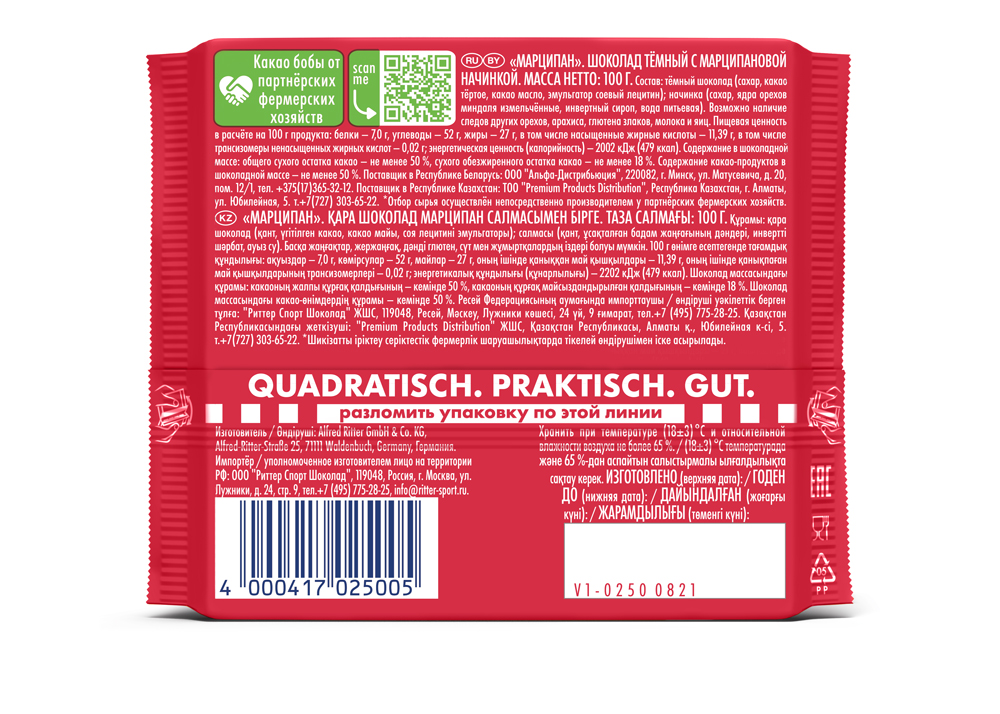 Шоколад горький с марципаном Ritter Sport, 100 г имеет темно-коричневый цвет и марципановую светло-кремовую начинку. Во вкусе и аромате чувствуются миндальные нотки марципана. Хрустящий шоколад хорошо сочетается с горячим кофе, чаем или капучино. Квадратные плитки Ritter Sport впервые были произведены в далеком 1932 году в Германии. Со временем из-за своей необычной формы, а также неповторимого вкуса десерт получил признание цивилизованных стран и вышел на мировой рынок.