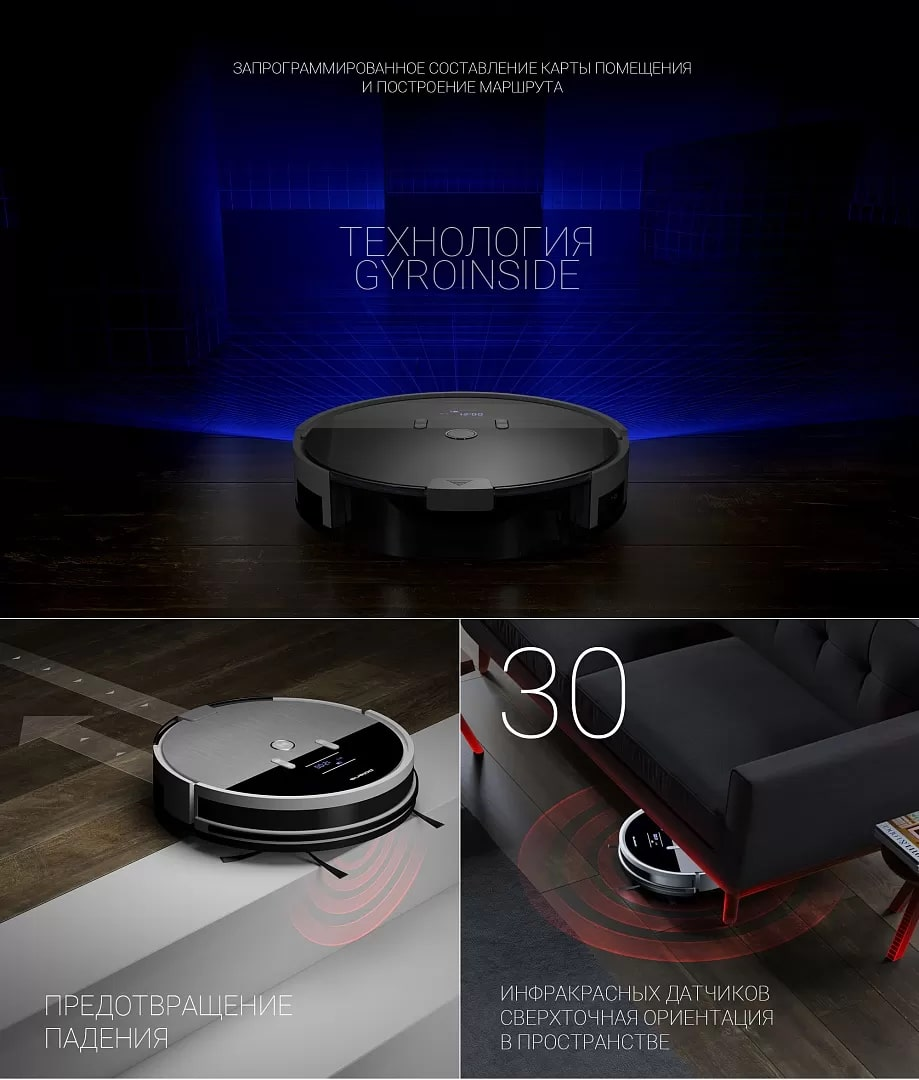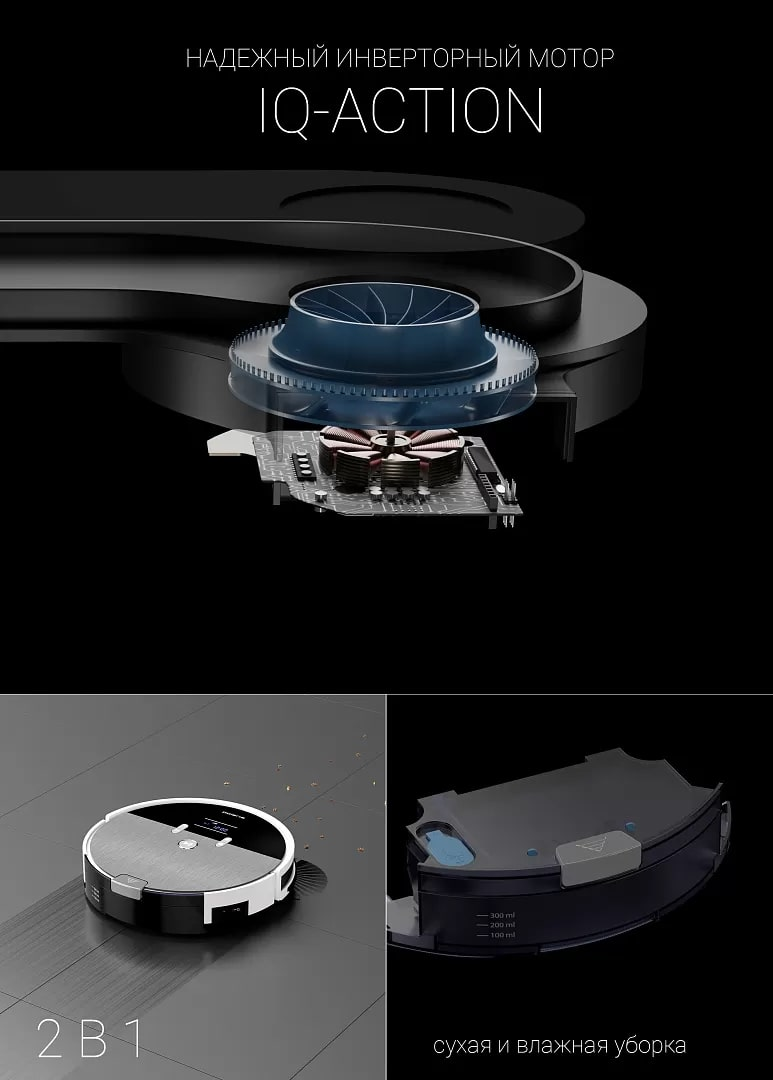 Полностью автоматическая уборка.Запрограммированное построение маршрута по технологии GyroInside.2-в-1 для сухой и влажной уборкиТехнология контроля подачи воды SmartDrop.Инверторный мотор IQ- Action.Объем контейнера для пыли 0.5 л.Объем контейнера для влажной уборки 0.3 л ( вода) + 0.2 л (пыль).Режимы мощности уборки 2.Основная электрощетка.Высота корпуса 76 мм.Пульт управления (работа от 2-х батареек ААА).
