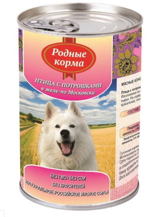 Консервы Родные корма по-московски для собак птица с потрошками в желе, 970г