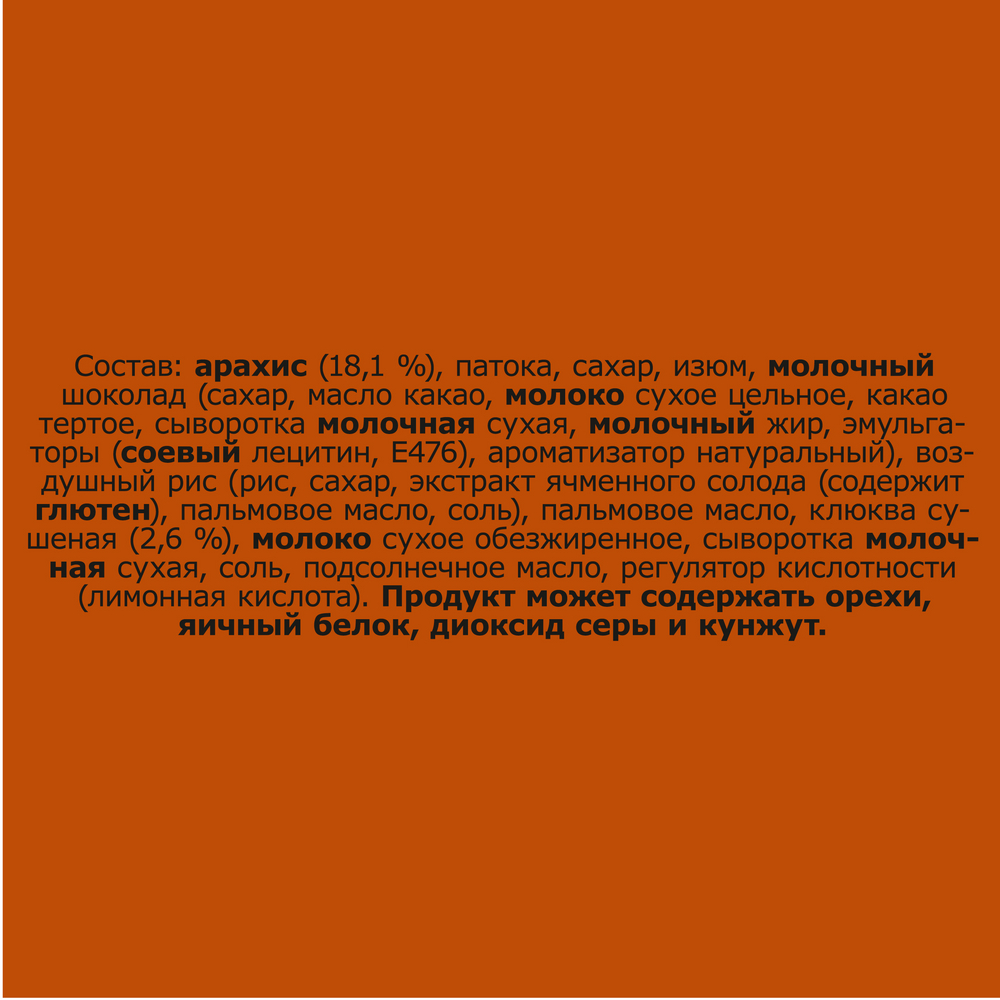 Это неповторимое сочетание отборных ингредиентов изысканного вкуса любимого молочного шоколада с нежной шелковистой текстурой. Деликатес содержит густую карамельную начинку с добавлением арахиса и клюквы. Продукт отличается неповторимым послевкусием благодаря ягодной кислинке.