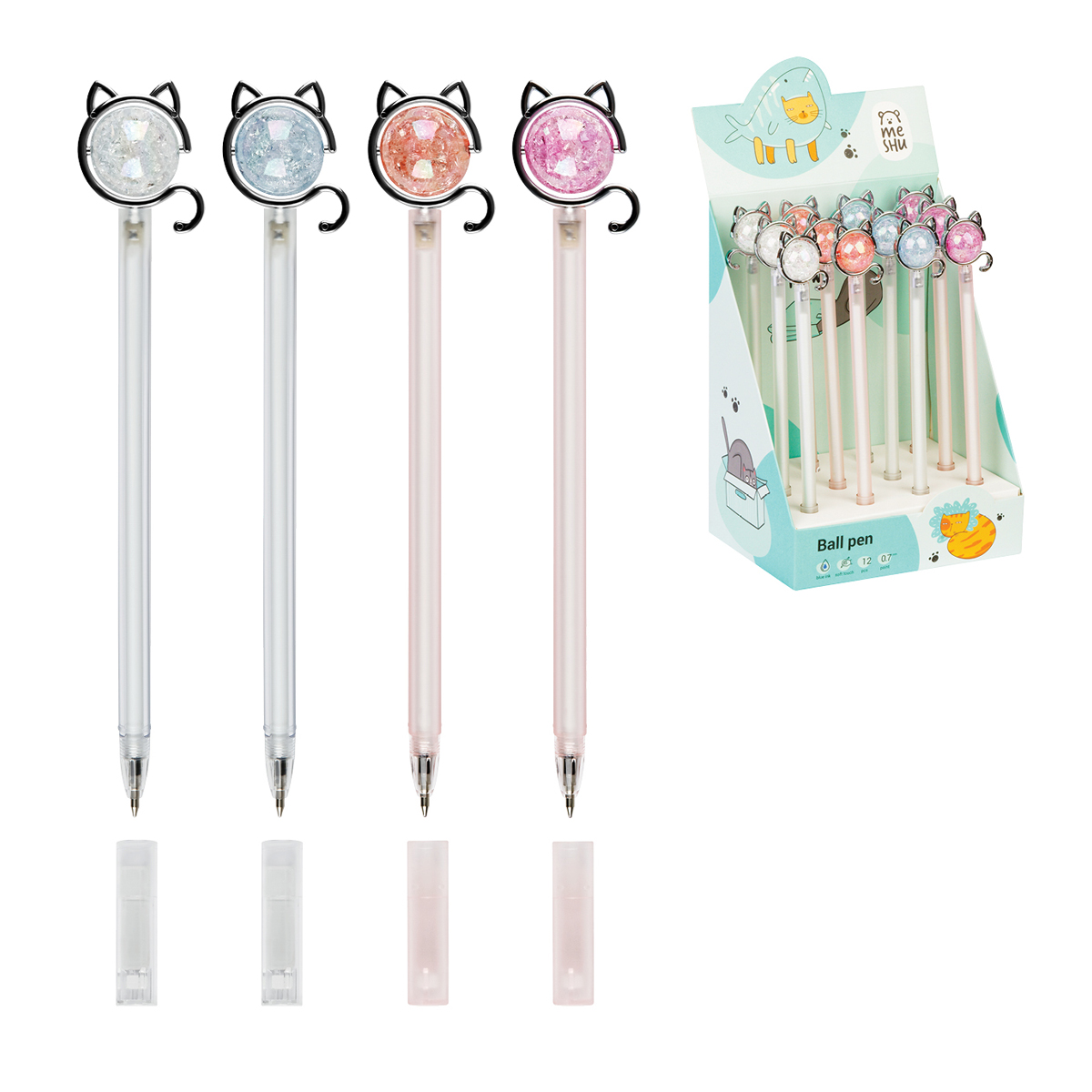 Ручка Meshu Cat шариковая станет атрибутом отличного настроения на работе или учёбе. Диаметр пишущего узла – 0,7 мм. Ручка прекрасно подойдёт для мягкого и быстрого письма. Толщина линии письма – 0, 5 мм, а длина письма может достигать от 450 до 500 метров. Ручка обладает необычным дизайном: круглый корпус нежных цветов дополняет милая игрушка-кристальный котик. У ручки есть пластиковый колпачок, который гарантирует, что изделие не повредитс�� в сумке и не оставит следов на посторонних предметах. Благодаря чернилам синего цвета ручку можно ежедневно использовать в работе или учёбе. Изделие предусматривает возможность замены стержня длиной 126 мм. Ручки упакованы в картонную коробку-дисплей.