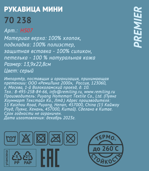 Рукавица-прихватка Remiling Premier серая, 13.9 x 22.8см
