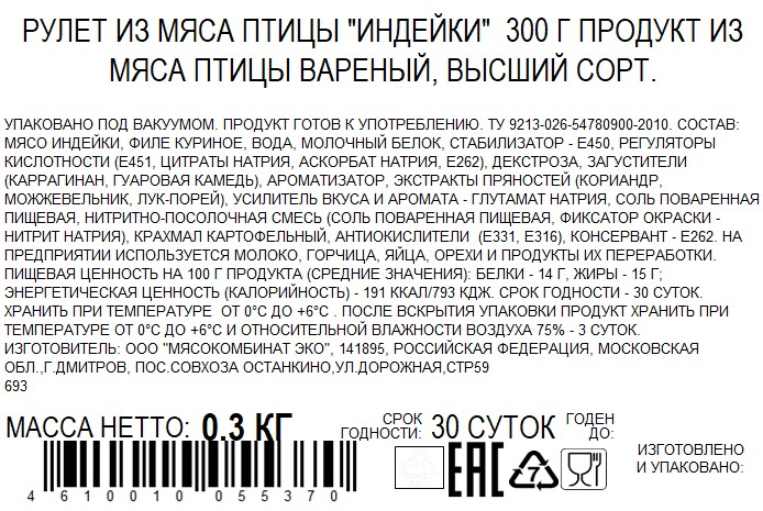 Мясо индейки, филе куриное, вода, молочный белок, стабилизатор Е450, регуляторы кислотности Е451, цитраты натрия, аскорбат натрия, Е262, декстроза, загустители каррагинан, гуаровая камедь, ароматизатор, экстракты пряностей кориандр, можжевельник, лук-порей, усилитель вкуса и аромата - глутамат натрия, соль поваренная пищевая, нитритно - посолочная смесь, фиксатор окраски нитрит натрия, крахмал картофельный, антиокислители Е331, Е316, консервант Е262.