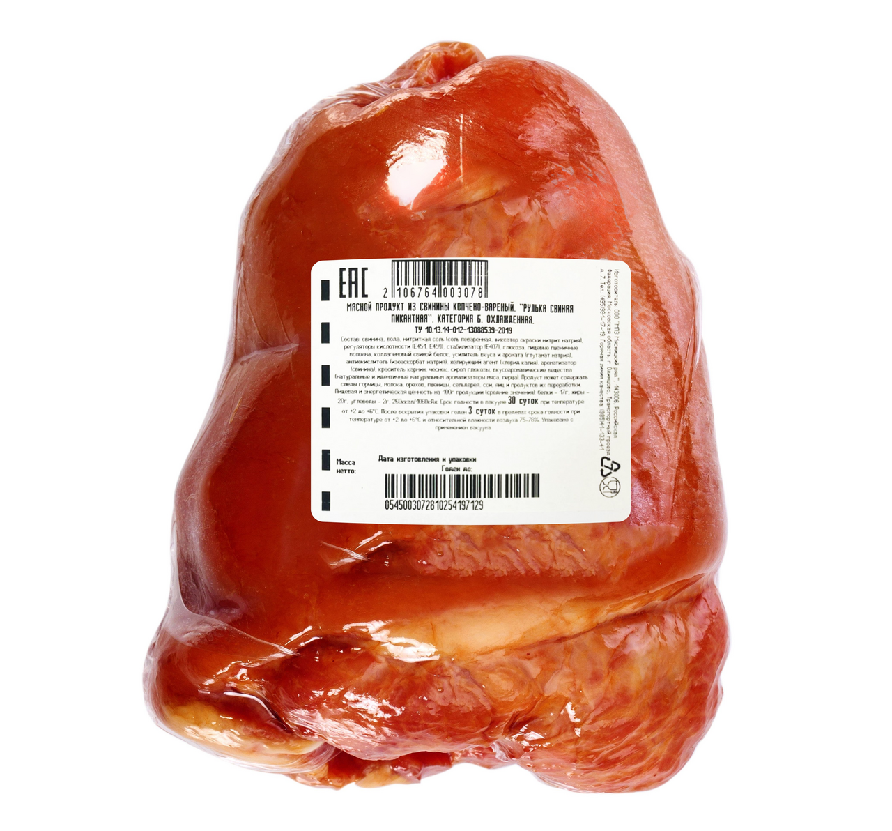Свинина, вода, нитритная соль поваренная, фиксатор окраски нитрит натрия, регуляторы кислотности Е451, Е450, стабилизатор Е407, глюкоза, пищевые пшеничные волокна, коллагеновый свиной белок, усилитель вкуса и аромата глутамат натрия, антиокислитель изоаскорбат натрия, желирующий агент хлорид калия, ароматизатор свинина, краситель кармин, чеснок, сироп глюкозы, вкусоароматические вещества натуральные и идентичные натуральным ароматизаторы мяса, перца.