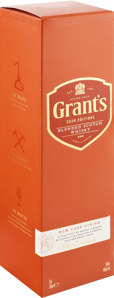 Виски Grant's Rum Cask Finish, 0,7 л – эксклюзивный в своем роде напиток, являющийся уникальным экспериментом Брайана Кинсмана и его команды, выдерживающийся в различных бочках. После продолжительной выдержки в дубовых бочках на завершающем этапе виски помещается в бочки из-под рома. Это позволяет получить гладкий, насыщенный, слегка сладковатый вкус с выраженными нотками карибского стиля. Этот виски мир увидел т��лько в 2018 году, и с тех пор бутылочка классного алкоголя обязательно присутствует в коллекции истинных ценителей напитка. Компания-производитель William Grant & Sons основана в 1886 году. На сегодняшний день традиции старых винокуров бережно хранят и соблюдают в пятом поколении семьи. Продукция предприятия известна практически во всем мире, поставляется в более чем 180 стран. Виски обладает янтарно-золотистым цветом. Вкус напитка маслянистый, слегка приглушенный. В нем четко прослеживаются оттенки солода и ноты тропических фруктов. В легком, теплом послевкусии сливаются нюансы йогурта, бананов, попкорна и поджаренных орешков. Сладковатый, обволакивающий аромат насыщен тонами карамели, ванили, солода. Виски употребляется как самостоятельный продукт или в составе коктейлей.