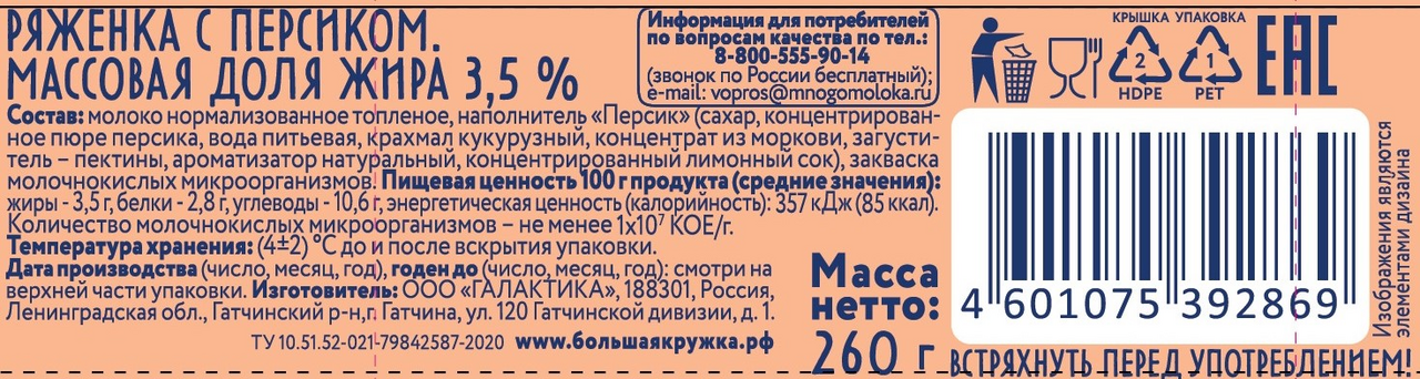 Ряженка с персиком Большая Кружка - кисломолочный продукт, приготавливаемый по классической технологии из топленого молока и живой закваски с добавлением натурального пюре печеного яблока и персика. Жирность 3,5% с мягким и нежным вкусом. Не содержит антибиотиков, консервантов и растительных жиров. Натуральный продукт для всей семьи.