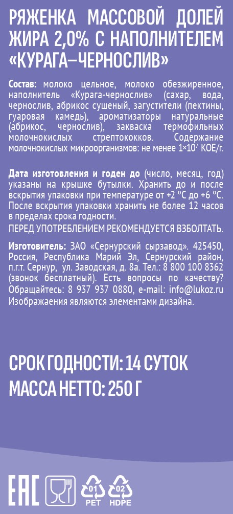 Ряженка Сернур курага и чернослив 2%, 250г