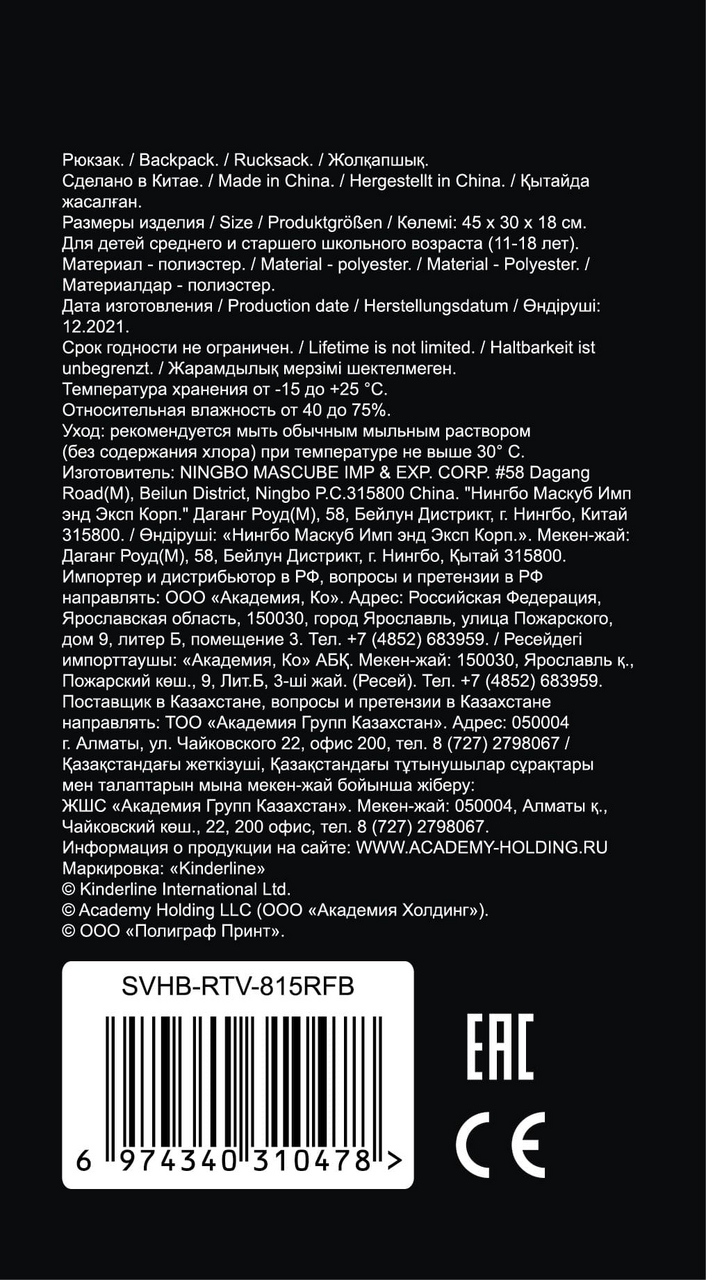 - Комплектация Рюкзак - 1 шт.