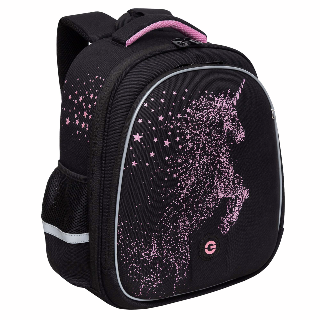 Рюкзак Grizzly RAZ-386 школьный черный-розовый - уже с начальных классов детям нужно носить в школьном рюкзаке книги, тетради и сменку. Нагрузки большие и рюкзак помогает с ними справляться. Ранец серии RAZ рассчитан на рост от 125 до 135 см. В него поместятся все школьные принадлежности. Основное отделение разбито на три отсека: для книг, тетрадей и папок А4. В дополнительное помещается сменка (есть три кармашка для мелочей). В боковых можно носить воду или перекус. Каждый предмет на своем месте.У рюкзака формованная лицевая часть, жесткая анатомическая спинка и жесткое дно на ножках. Содержимое надежно защищено. Такая конструкция равномерно распределяет нагрузку на спину. Чтобы не уставали руки и плечи, мы сделали широкие лямки и нагрудную стяжку со свитком. Для безопасности в темное время суток мы добавили со всех сторон светоотражающие элементы. За счет водо- и грязеотталкивающей пропитки ранец долго остается как новый. Если он все же чем-то испачкался, мы рекомендуем ручную стирку в холодной воде.