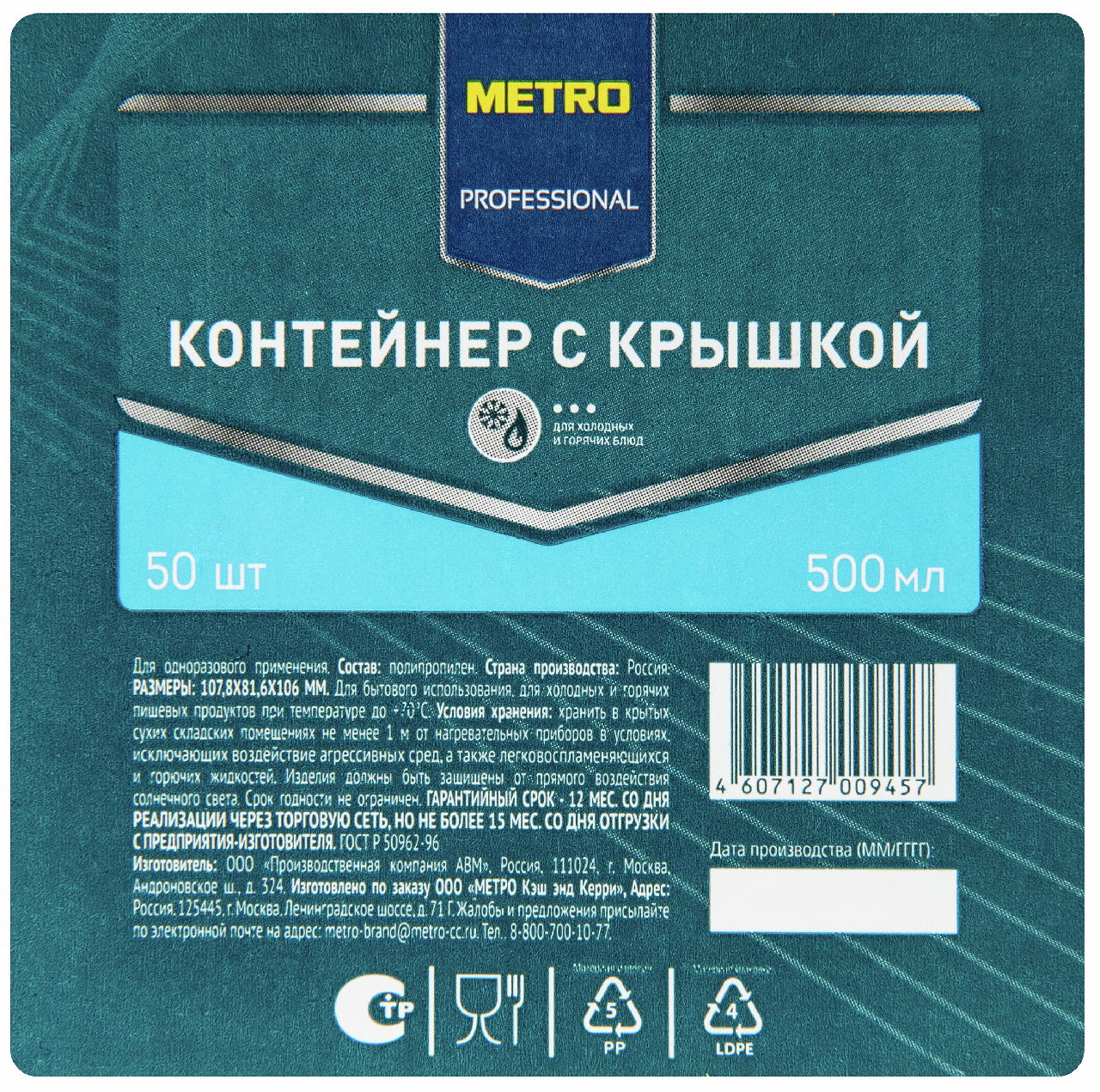 METRO PROFESSIONAL Контейнер с крышкой на 500 мл – идеальное решение для удобного хранения всевозможных блюд. Емкость выполнена из высококачественного полипропилена. Эргономичный дизайн и прозрачный материал позволяют легко определить содержимое. Контейнер отлично подходит для горячих и холодных продуктов. В закрытом состоянии он обладает высокой герметичностью, благодаря чему содержимое остается свежим длительное время. Это отличный вариант для использования в домашних условиях, для офиса и пикника. К тому же с помощью таких контейнеров вы легко наведете порядок в холодильнике. Уход за контейнером прост и удобен. Он легко моются вручную или в посудомоечной машине, сохраняя свою первоначальную презентабельность, даже после многократного использования. Неограниченный срок годности, стильный дизайн, удобство использования — все это делает емкость с крышкой удобной и надежной. В комплект входят 50 контейнеров.