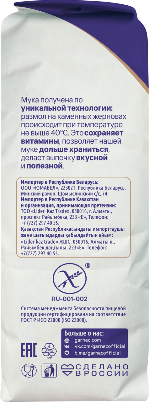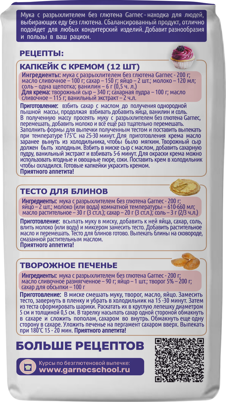 Безглютеновая смесь Мука с разрыхлителем в области применения в кулинарии аналогична самоподнимающейся пшеничной муке. Её основное применение – приготовление тортов, бисквитов, пирожных, печенья, пряников, кексов и других видов выпечки. Данный продукт не содержит глютен. Отсутствие глютена проверяется на каждом этапе производства. Компания Гарнец первой в России получила право маркировать свои продукты Перечеркнутым колосом - знаком безопасности безглютеновой продукции, признанным в большинстве развитых стран.