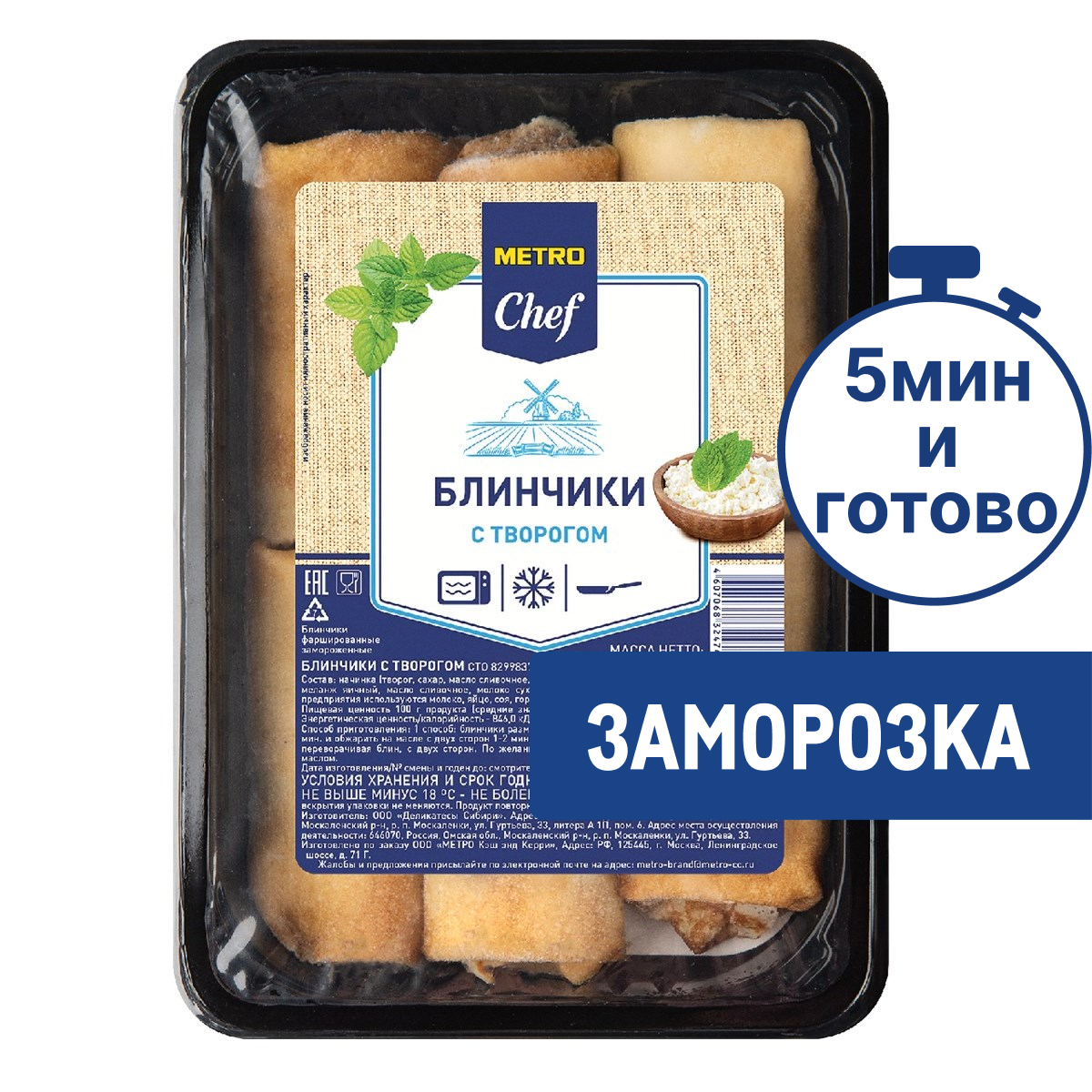 Блинчики с творогом METRO Chef, 1 кг — это ароматный полезный завтрак, легкий и быстрый перекус. Преподносить блинчики также можно в качестве десерта к чаю или какао, в роли второго блюда. Они поддаются обжариванию на сковороде с добавлением сливочного масла или разогреву в микроволновой печи. Сопроводить блины с начинкой можно сметаной, йогуртом, сгущенным молоком, джемом или фруктовым вареньем. Продукт для полноценного и правильного питания заменит яичницу или омлет, белковой завтрак и любую кашу. В состав творожной начинки входят фосфор и кальций для формирования костной системы. Высококалорийное блюдо станет естественным источником энергии для организма в период интенсивной физической нагрузки, спортивных тренировок.