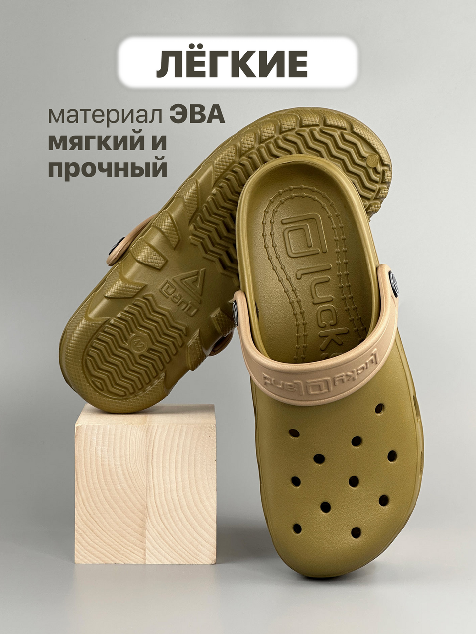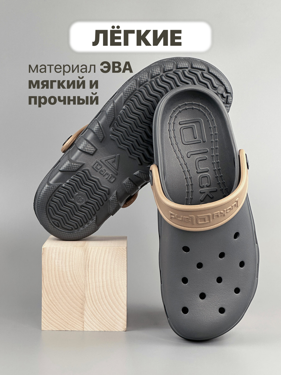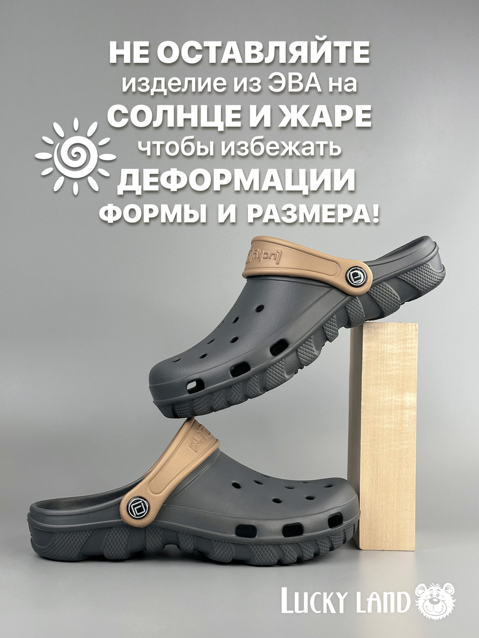 Ультра комфортные мягкие мужские сабо Lucky Land из легкого материала EVA. Обувь мужская из эва сохраняет форму при высоких нагрузках и продолжительной носке, отличается эластичностью и упругостью. Гибкие и практичные кроксы клоги в несколько раз легче и мягче, чем резиновые шлепанцы. Имеют акцентный ремешок для фиксации стопы при ходьбе. Стильные мужские шлепки сабо идеально подходят для работы, для сотрудников обслуживания и медицины (для поваров, для медработников, для массажистов, медицинских центров и салонов красоты). Обувь из эва проста в уходе и эксплуатации, достаточно протереть влажной тряпкой. Летние мужские тапки идеально подойдут для спортзала и бассейна, для дома, для пляжа, для дачи и огорода, для повседневной носки на каждый день (медицинские/рабочие/поварские). Дизайн нашей обуви - оптимальное соединение прекрасного внешнего вида, удобства и практичности.
