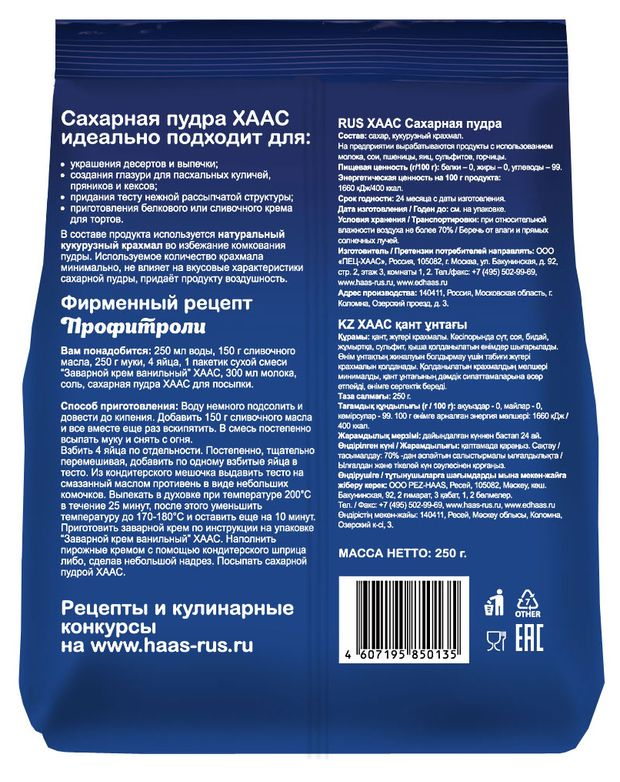 Сахарная пудра Haas, 250 г – продукт с натуральным составом. В него входят сахарная пудра и кукурузный крахмал. Упаковка достаточно большая, а это значит, что ее хватит надолго. Сахарная пудра имеет белоснежный цвет и однородную текстуру. Она легкая и рассыпчатая. Вкус – приятно сладковатый. Она отлично подойдет для посыпки различных тортов, булочек и любой выпечки. Также ее можно использовать для приготовления кремов и прослоек. На оборотной стороне упаковки есть подробный рецепт приготовления пирожных с использованием пудры.