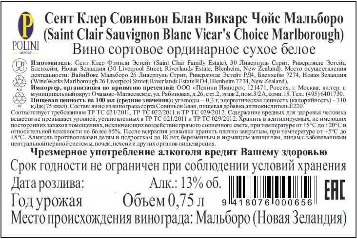 Вино SAINT CLAIR Sauvignon Blanc, белое сухое, 0,75 л – соломенно-желтый напиток, хорошо подходящий к вегетарианским блюдам, лососю и тунцу. Он обладает мягкими и чистым вкусом, в котором прослеживаются фруктовые и цветочные оттенки. В сухом послевкусии ощущается приятная кислинка. Аромат освежающий, сочетающий в себе доминирующие оттенки маракуйи, крыжовника и трав. Для изготовления напитка используется исключительно сорт совиньон бланк. Оптимальная температура сервировки составляет 8–10 C. Для подачи на стол лучше выбрать небольшие бокалы, например, с формой тюльпана и короткой ножкой. Если бокал будет иметь слегка раскрытые края, то такая форма выгодно подчеркнет присущие напитку сладость и нежный аромат. Заполнять бокал следует лишь на треть – это позволит увеличить площадь контакта напитка с воздухом, что будет способствовать раскрытию его вкуса.Производитель напитка – компания Сент Клер Фэмили Эстейт, основанная в 1978 году супругами Ибботсон: Нилом и Джуди. На первых этапах семейная пара занималась продажей винограда местным винодельням, но уже в 1994 г. они запустили собственное производство. Дебют в итоге оказался весьма успешным, так как винная продукция их компании завоевала немало наград. В настоящее время она поставляется примерно в 35 стран мира. Напиток разливается в удобные и оригинальные бутылки с креативной винной этикеткой, имеющей запоминающийся дизайн. Приобрести вино SAINT CLAIR Sauvignon Blanc, белое сухое, 0,75 л можно в торговом центре METRO. Меры предосторожности: алкоголь противопоказан детям и подросткам до восемнадцати лет, беременным и кормящим женщинам, лицам с заболеваниями центральной нервной системы, почек, печени и других органов пищеварения. Чрезмерное употребление алкоголя вредит вашему здоровью.