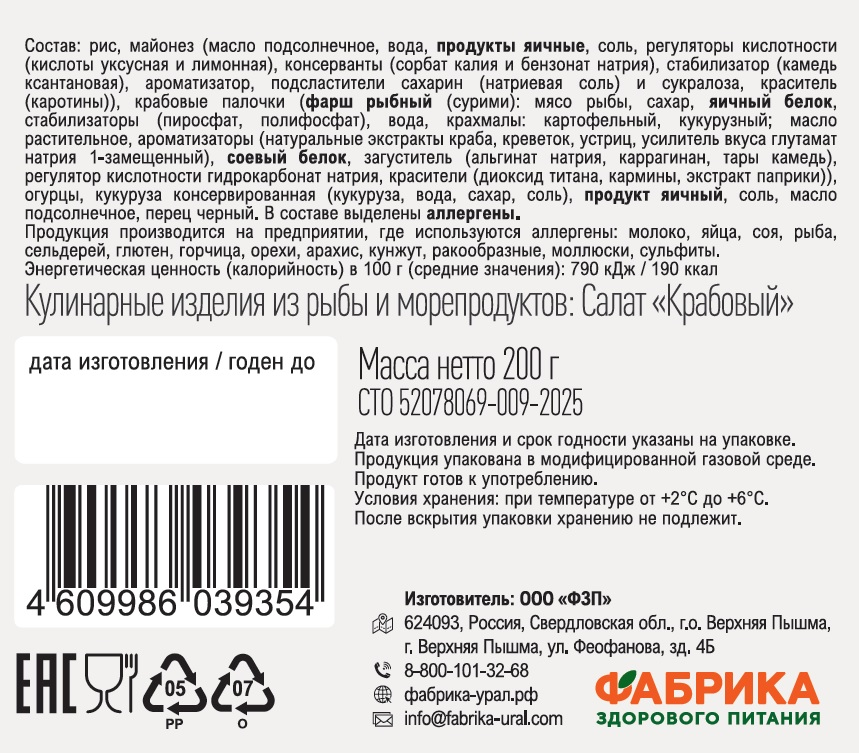 Рис отварной вода, рис, масло подсолнечное, соль, майонез масло подсолнечное, вода, продукты яичные - соль, регулятор, кислотности кислоты уксусная и лимонная, консерванты сорбат калия и бензонат натрия, стабилизатор камедь ксантановая, ароматизатор, подсластители сахарин натриевая соль и сукралоза, краситель каротины, крабовое мясо сурими фарш рыбный из зоологических видов рыб: желгоподосатая сардинелла Sardinella gibbose, чёрный джоний Johnius dussumieri, тумбиль Saunda tumbil, агент влагоудерживающий полифосфаты, вода, крахмал пшеничный, крахмал кукурузный, масло растительное, загуститель дикрахмалфосфат, белок соевый, соль, сахар, агент желирующий каррагинан из водорослей EUCHEMA, красители карм лины, экстракт паприки, диоксид титана, усилители вкуса и аромата глутамат натрия 1-замещенный, 5-гуанилат натрия 2-замещенный, 5-инозинат натрия 2- замещённый, белок яичный, стабилизатор каррагинан из водорослей EUCHEMA, огурцы, консервированная кукуруза сладкая, вода, сахар, соль, регулятор кислотности лимонная кислота, продукты яичные, консервант сукцинат кальция, дигидрокверцетин эпсилон-поли-L-лизин, мальтодекстрин, перец чёрный.