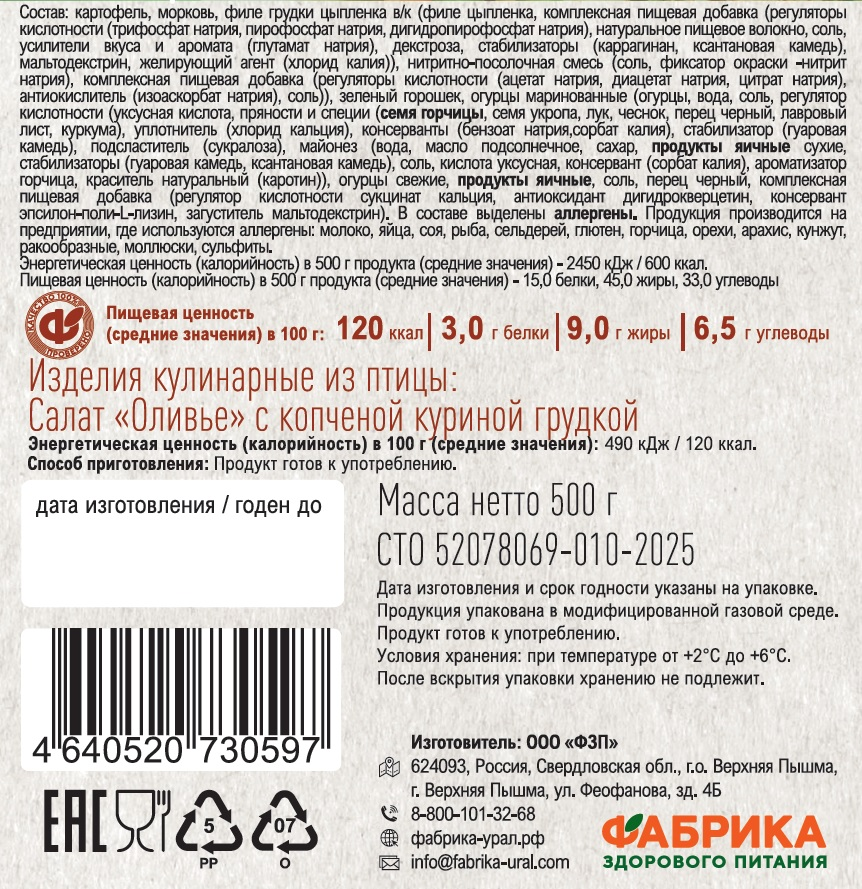 Картофель, морковь, филе грудки цыплёнка варено-копчёное филе цыплёнка, вода, комплексная пищевая добавка регуляторы кислотности трифосфат натрия, пирофосфат натрия, дигидропирофосфат натрия, натуральное пищевое волокно, соль, усилители вкуса и аромата глутамат натрия, декстроза, стабилизаторы каррагинан, ксантановая камедь, мальтодекстрин, желирующий агент хлорид калия, нитритно-посолочная смесь соль, фиксатор окраски - нитрит натрия, комплексная пищевая добавка регуляторы кислотности ацетат натрия, диацетат натрия, цитрат натрия, антиокислитель изоаскорбат натрия, соль, зелёный горошек, огурцы маринованные огурцы, вода, соль, регулятор кислотности уксусная кислота, пряности и специи семя горчицы, семя укропа, лук, чеснок, перец чёрный, лавровый лист, куркума, уплотнитель хлорид кальция, консерванты бензоат натрия, сорбат калия, стабилизатор гуаровая камедь, подсластитель сукралоза, майонез вода, масло подсолнечное, сахар, продукты яичные сухие, стабилизаторы гуаровая камедь, ксантановая камедь, соль, кислота уксусная, консервант сорбат калия, ароматизатор горчица, краситель натуральный каротин, огурцы свежие, продукты яичные, соль, перец чёрный, комплексная пищевая добавка регулятор кислотности сукцинат кальция, антиоксидант дигидрокверцетин, консервант эпсилон-поли-L-лизин, загуститель мальтодекстрин.