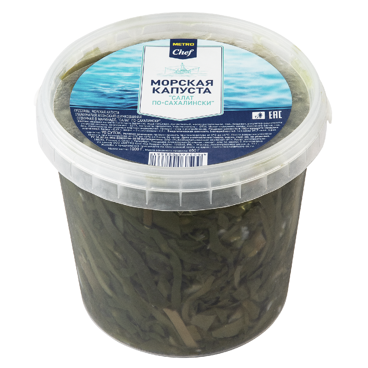 Салат из морской капусты – вкусное и сочное, полезное блюдо. В состав продукта входит большое количество витаминов, минералов и микроэлементов, поддерживающих здоровье и наполняющих энергией. Салат можно употреблять в готовом виде, он обладает приятным, слегка кисловатым вкусом и ароматом морепродуктов. Идеально сочетается с разными продуктами, в том числе отварными яйцами, овощами, грибами, мясом, рыбой. Если слить лишнюю жидкость, можно заправить морскую капусту майонезом или сметаной, другими соусами по выбору. Продукт рекомендован для диетического и детского питания, подойдет для праздничного и повседневного стола.Приобрести салат из морской капусты, 1 кг можно в торговом центре METRO.Состав: капуста морская, вода, морковь, лук репчатый, перец черный,масло растительное, сахар, соль, лимонная и уксусная кислоты, консервантЕ211, эссенция для холодного маринада.Страна: Россия. Тип: салат.Масса нетто: 1 кг. Пищевая ценность: белков – 1 г, жиров – 5 г, углеводов – 4 г. Энергетическая ценность: 65 ккал.Упаковка: пластиковая банка.Срок хранения: 3 месяца.Условия хранения: при температуре от 0C до +6C.