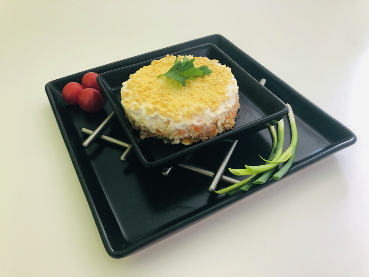 Подходит для того, чтобы стать обедом или ужином даже в будни. Сытный, но не жирный, красиво уложенный слоями. Его сердце — нежная отварная горбуша, а яркие кусочки яичных желтков действительно напоминают цветы мимозы.