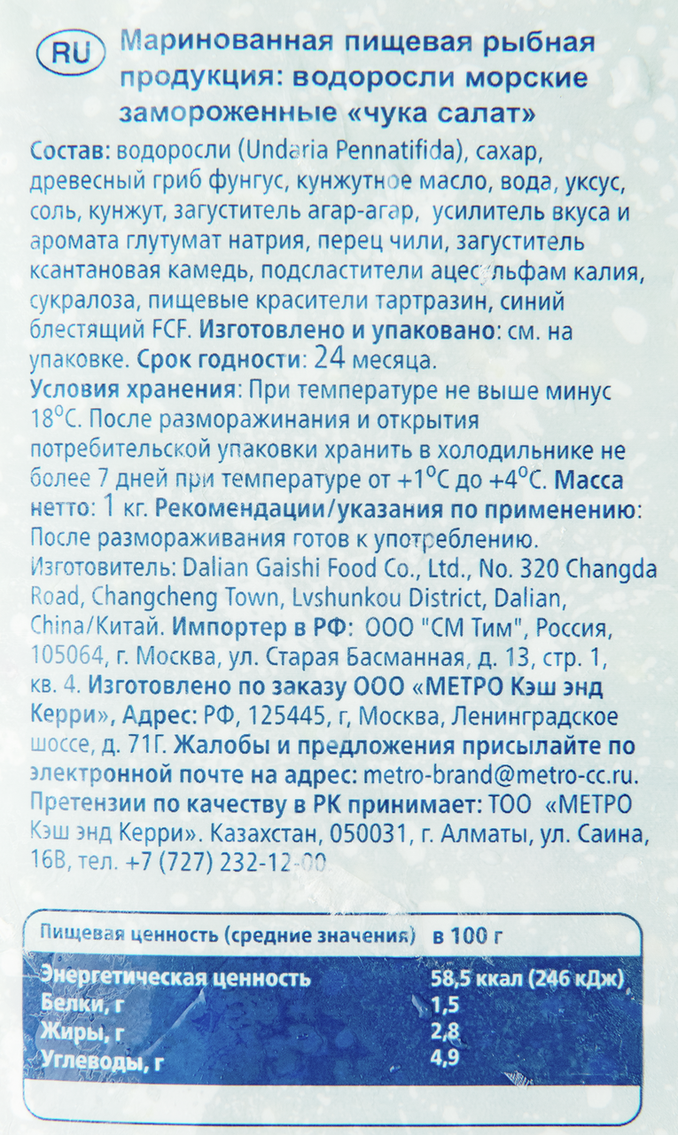 Салат METRO Chef Чука замороженный, 1 кг – это продукт, который можно употреблять как самостоятельное блюдо или использовать в качестве добавки к роллам. Он приготовлен из ундарии — водоросли, являющейся одним из элементов традиционной кухни Японии. Салат дополнен семечками кунжута, древесным грибом и другими ингредиентами. Ундария является не только диетической пищей, но и продуктом, богатым полезными веществами: йодом, кальцием, витаминами А, С, В, РР, К. Она насыщена протеинами, содержит много клетчатки и антиоксиданты, которые выводят шлаки и токсины. Салат имеет нежный и оригинальный вкус, который понравится ценителям восточной кухни. Выпуская продукцию под собственными торговыми марками METRO, мы стремимся максимально удовлетворить потребн��сти наших клиентов. Наша цель - понять, какой ассортимент для них актуален и предложить его по привлекательной цене. Мы также внимательно изучаем тенденции рынка, чтобы быть в курсе последних трендов и своевременно предлагать решения под собственными торговыми марками в соответствии с ними.