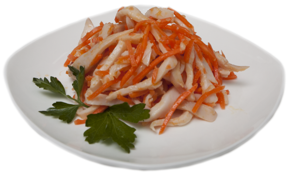 Это полезное и аппетитное блюдо азиатской кухни. Морковь имеет свежий пряный вкус, знакомый многим. Любители морепродуктов оценят добавление в салат маринованных кальмаров. В составе нет искусственных добавок — только натуральные ингредиенты. Продукт отличается низкой калорийностью.