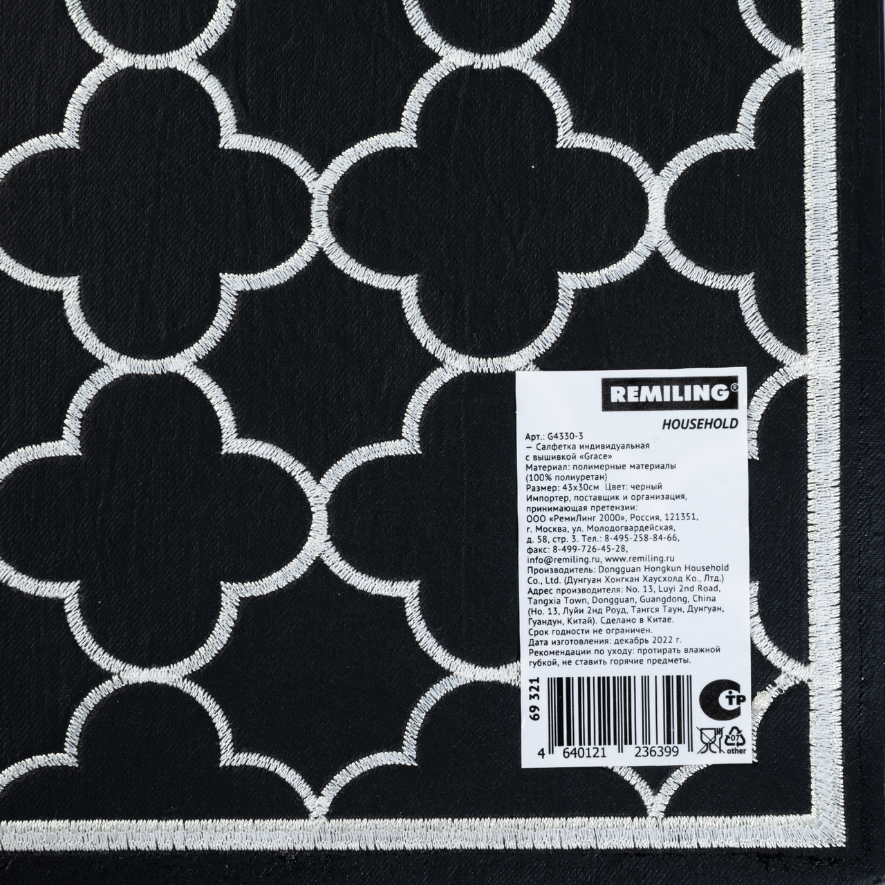 Салфетка Remiling Household Grace черный с вышивкой, 43 x 30 см имеет традиционную прямоугольную форму и аккуратно обработанные края. Ее можно использовать как по назначению – для горячих напитков, так и для обычной посуды. Благодаря такой салфетке посуда не скользит на столе. От любых загрязнений изделие с легкостью очищается с помощью обычной воды и моющих средств. Салфетки можно использовать как ежедневно, так и для праздничного стола.