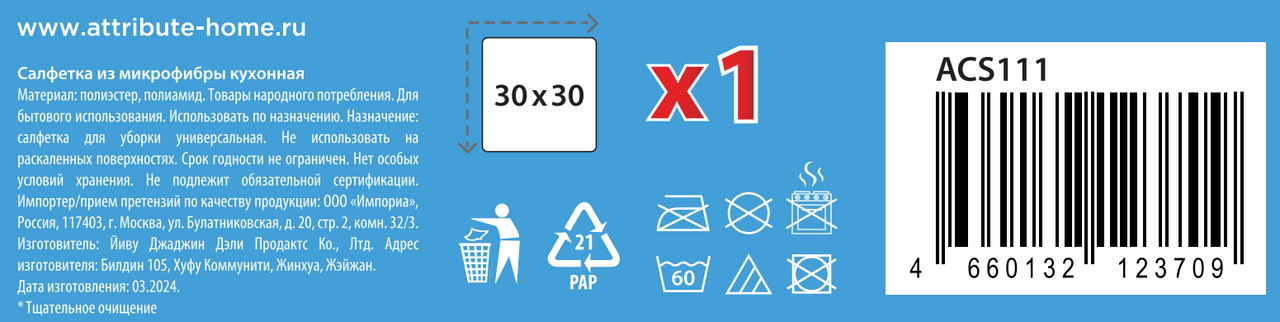 Салфетка Attribute кухонная микрофибра, 30 x 30см