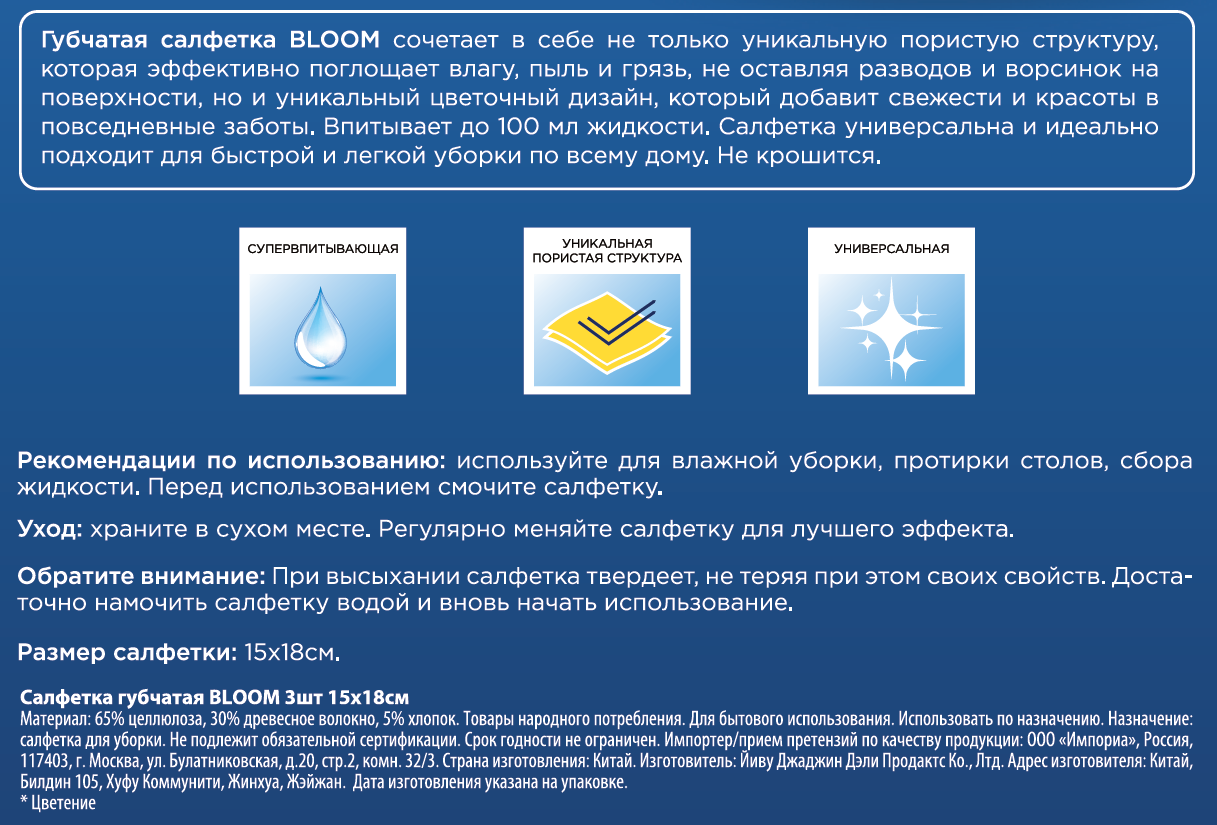 В упаковке представлены целлюлозные (губчатые) салфетки в количестве 3 шт. разного цвета. Увеличенная плотность материала - 550 г/м2 - обеспечивает повышенную устойчивость к износу и возможность неоднократного применения без потерь характеристик. Салфетки из целлюлозы идеальны для влажной уборки, поскольку прекрасно вбирают в себя жидкости, не оставляет ворса, разводов, царапин даже на деликатных участках. Благодаря их нескользящей, шероховатой поверхности загрязнения устраняются максимально эффективно.