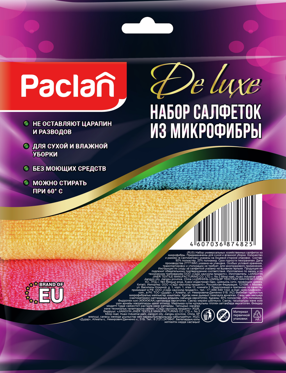 Салфетка Paclan из микрофибры 30 х 30см, 4шт идеальный набор для практичных хозяек. Салфетка обладает электростатическими свойствами. Микроскопические треугольники втягивают все виды частиц пыли внутрь волокна с помощью контактной электризации и предотвращают их выпадение. Ткань из микрофибры буквально всасывает в себя грязь, надежно удерживая ее между микроволокнами. Полиамид в составе микрофибры удерживает воду, полиэстер (нейлон) – поглощает жир. Ни один обычный материал не удаляет жир с поверхности так легко как микрофибра, без использования чистящих и моющих средств! Сокращает расход моющих средств на 85%. Уникальный очищающий и антибактериальный эффект. Микрофибра с высокой плотностью проникает в самые мелкие щели и устраняет бактерии и микробы с поверхности. Эффективность и скорость. Микроволоконные ткани впитывают примерно в 10 раз больше жидкости, чем хлопок, удаляют грязь намного быстрее и эффективнее любой натуральной ткани, не оставляя разводов и ворсинок. Долговечность. Одна микроволоконная салфетка заменит до 50 обычных текстильных бытовых салфеток.
