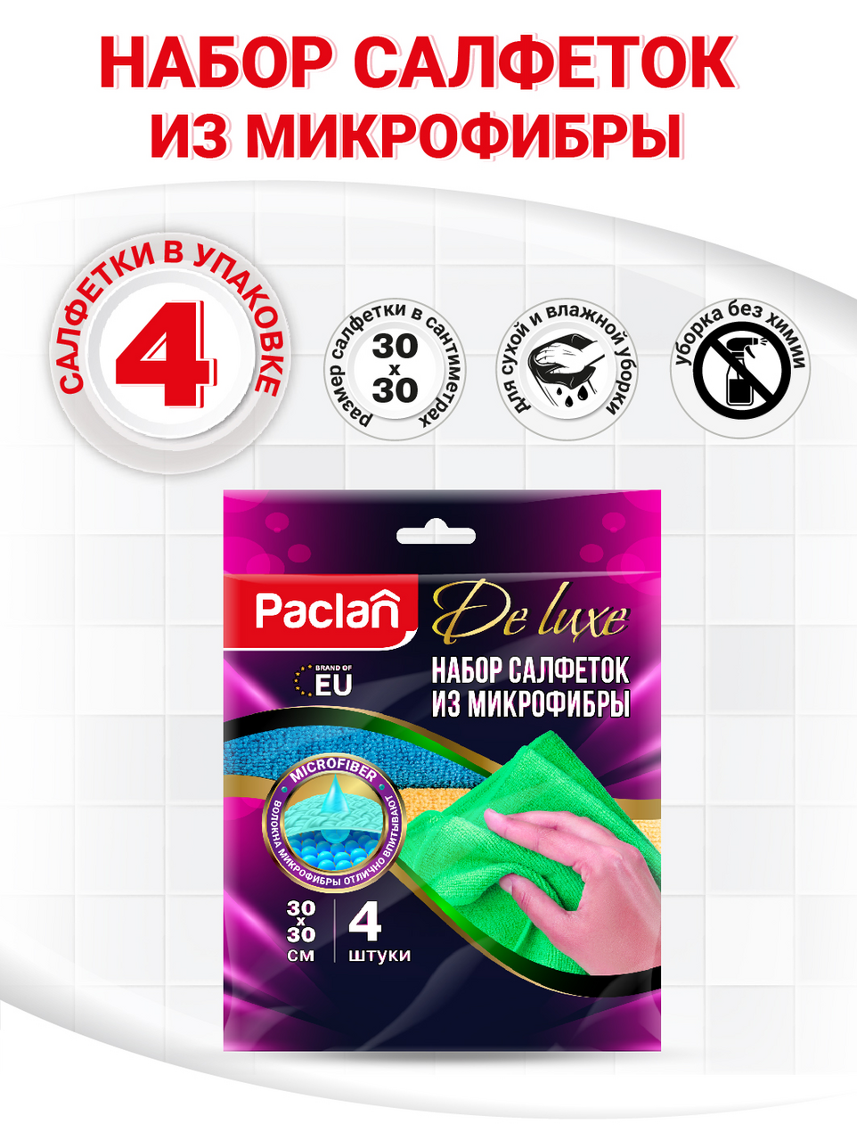 Салфетка Paclan из микрофибры 30 х 30см, 4шт
