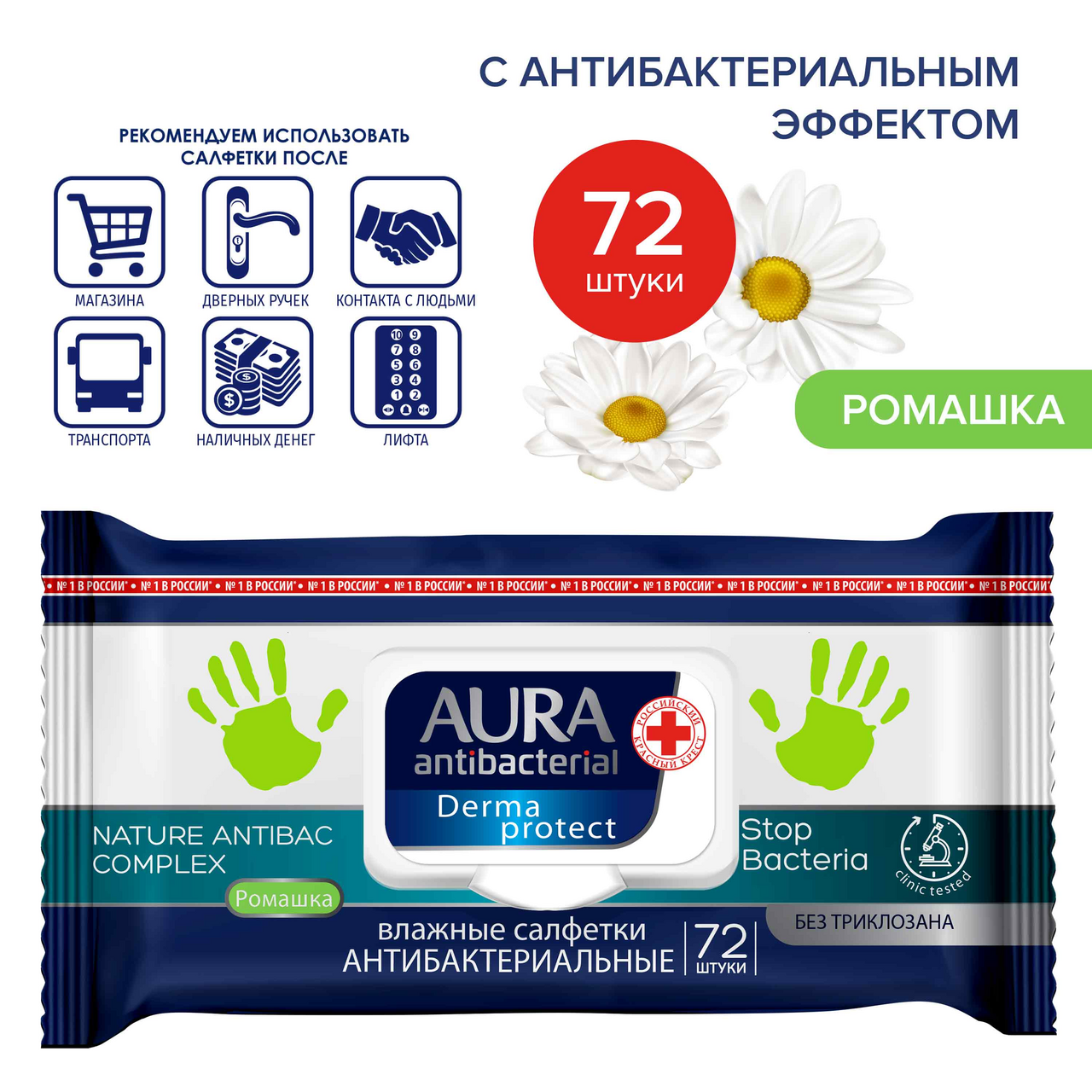 Салфетки влажные антибактериальные, 72 штуки. Изготовлены из мягкого нетканого материала, пропитанные специальным антибактериальным лосьоном, предназначены для быстрой обработки рук и предметов общего пользования. Экстракт ромашки, обладающий антибактериальным, противовоспалительным, антисептическим действием, усиливает процессы регенерации, устраняет раздражение, смягчает кожу. Салфетки обеспечат длительную, надежную защиту без вредного воздействия на кожу. Обладают пролонгированным антибактериальным эффектом.