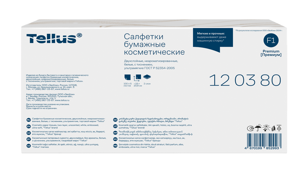 Салфетки бумажные Tellus Premium F1 косметические для лица ультрамягкие, 100шт